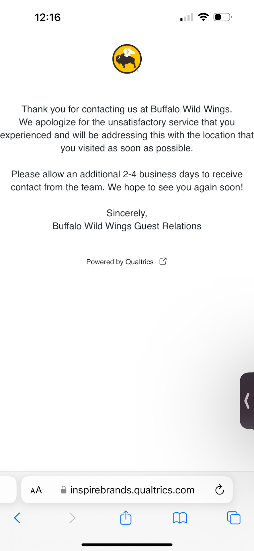 I called in to place my order, gave my number for my rewards. I ordered 1 10 piece boneless - thai curry and 1 10 piece boneless - parm garlic and 1 large wedge. I order the same thing every time. Upon speaking with the cashier, she informed me that you no longer can put green onions on the wedges (with a very bad attitude). I informed her that I had just ordered the same thing a week ago and she still did not extend the courtesy.
