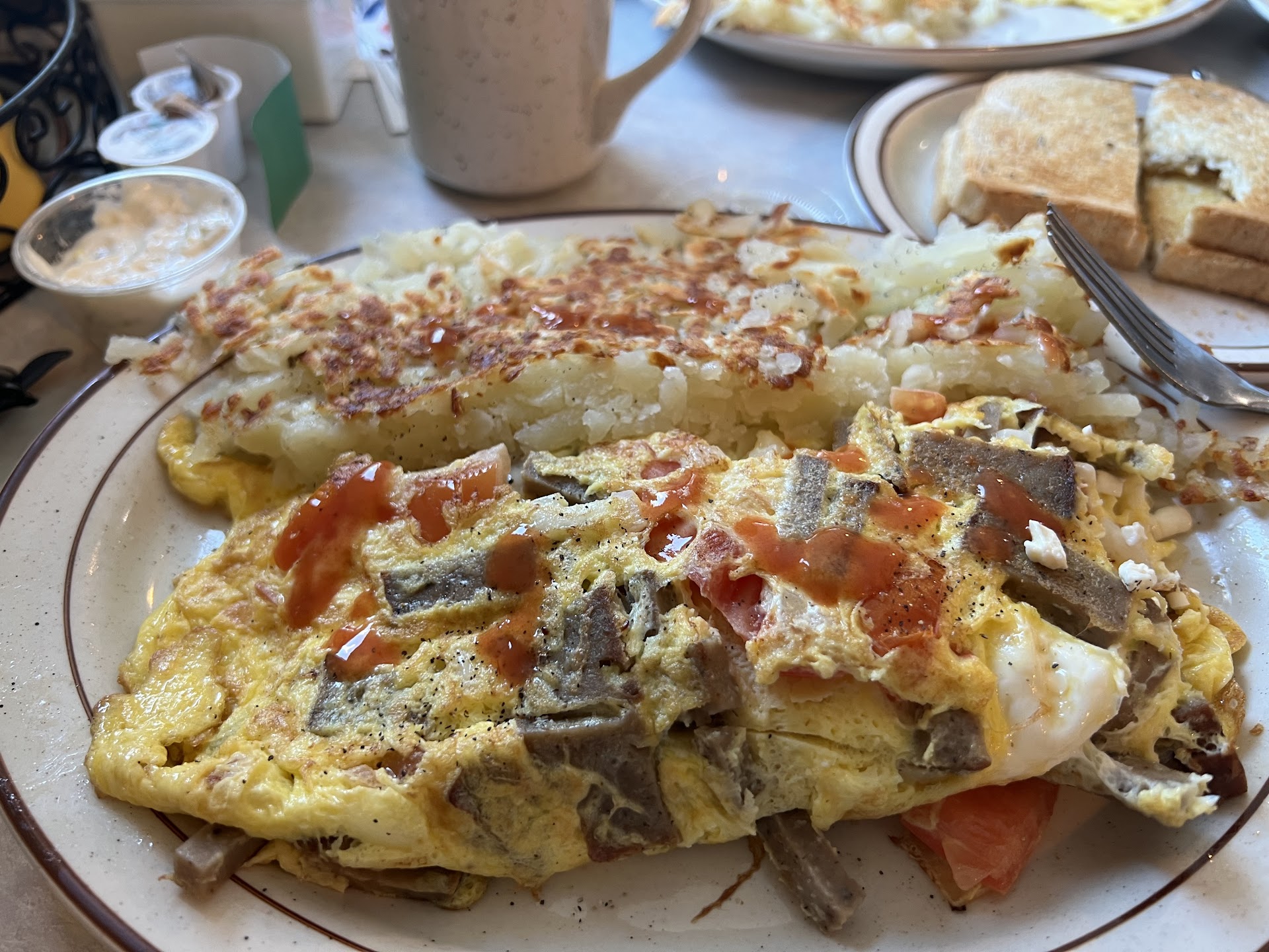 The restaurant is generally fairly close to packed during even off-peak morning hours, making seating something of a premium. The seating is comfortable, but the whole air of the restaurant, from the old stained fiberboard ceiling tiles to the weathered appearance of everything does not make the atmosphere immediately appealing. Entry is also a bit of an issue. If you are entering through the cramped doorways at the same time as someone is leaving, you will definitely need to plant yourself against a wall to give room to enter and exit. I can't call this location handicap accessible, though I am certain that you could wrestle a wheelchair inside. Parking is extremely tight in peak hours and less than convenient with how the lines are angled in the parking lot.