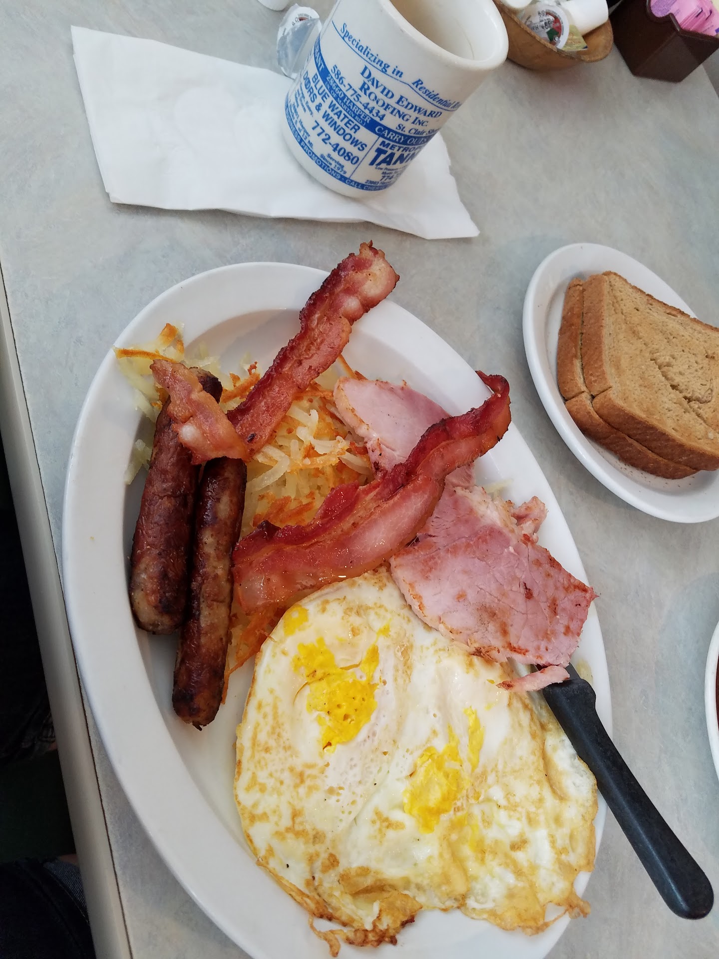 Negative: I am not actively displeased with the quality of the food, but I am also not actually pleased. One look at the ingredients shows that what is used is as base level as possible. As an example, the "Slim Jim" was housed in an over the counter hoagie bun compressed and pressed in the skillet to flatten it, given it a dried out, generally unpleasant quality. The ham, too, had a dried quality that indicated it had been somewhat overcooked or left under the heat lamp too long. Every single dish had the same quality of being overdone or left in the heat lamp just long enough that the product had hardened and dried out. The food was edible and not outright unpleasant, but it was the kind of diner fare that you can have at any of a number of diners in the Detroit Metro Area. We are inundated with them, and the caliber of so many is unimpressive and does not stand out.