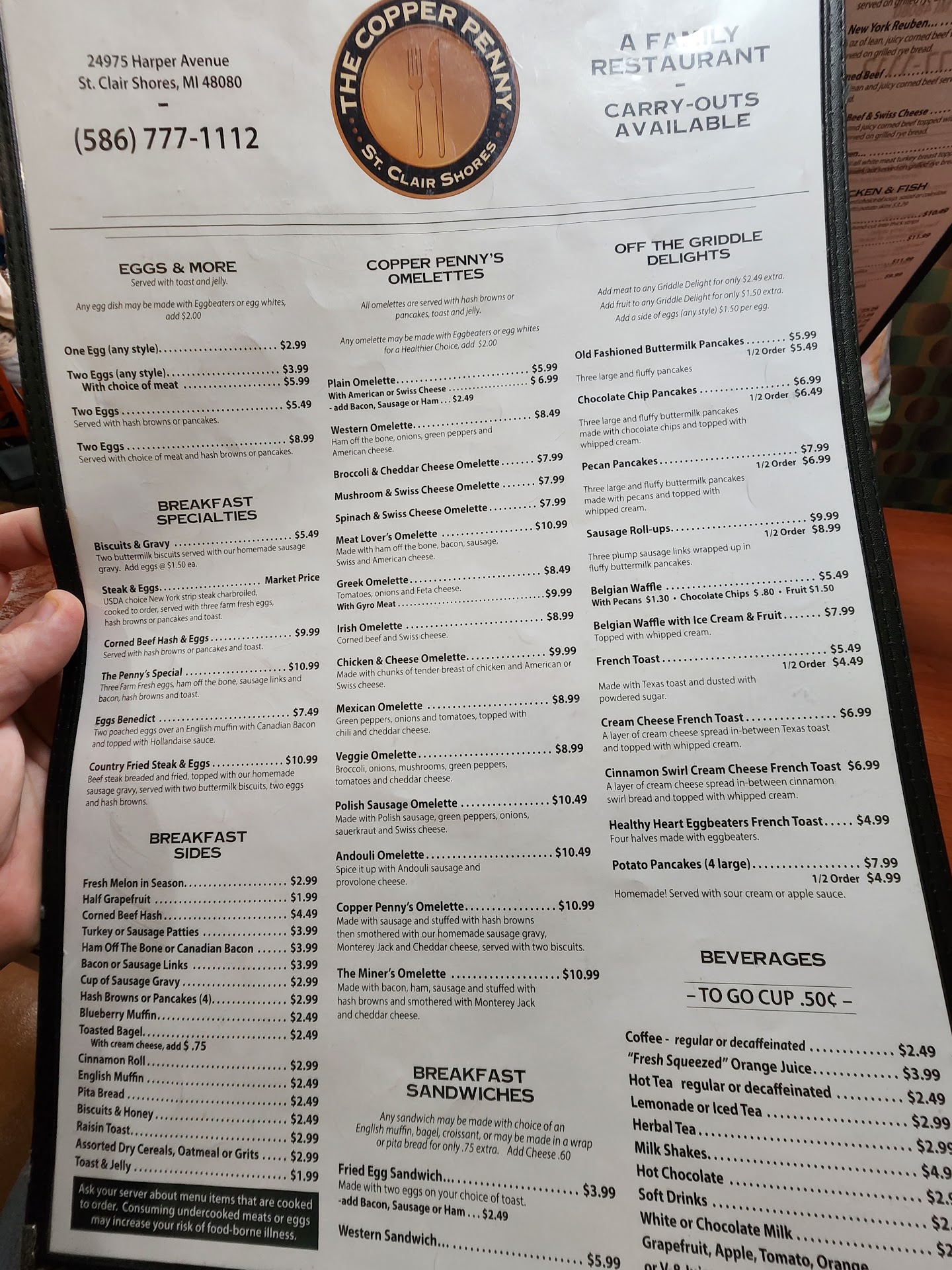 A friend and I stopped in for breakfast after a doctor appointment. The restaurant was over half full, we were seated right away and our drink order was taken. They have a vast menu with lots of choices. I chose the french toast with a side of bacon, our waitress gave me several options to customize my french toast, I opted to limit it to topped with powdered sugar and cinnamon, butter and syrup. My friends chose the Copper Penny Omelet, filled with sausage, sausage gravy, hash browns, and cheddar and montery jack cheese. The omelet was supposed to come with biscuits and honey, but they were out of biscuits so my friend opted instead for sourdough toast. Our food arrived promptly, very hot and fresh. My plate had 6 triangles of thick cut french toast with a generous sprinkle of both powdered sugar and cinnamon, and a nice mound of butter melting over the hot toast, warm syrup in a decanter was served with it. My friends Copper Penny Omelet was huge! It had to be at lease3-4 eggs large and the stuffings and cheese both inside and out were plentiful. I can't recall the last time I saw such a hearty omelet. I sampled a bite and it was delicious! We were very happy with our food. The other thing we were very happy with was the service. Our waitress, as well as the other waitresses were just wonderful! They were very personable and very attentive. My coffee cup was always filled without having to ask. My friends water glass was filled as well. We both had plenty of leftovers and our waitress brought take out boxes for us and filled them with our leftovers. Seeing that I was handicapped and used a walker, she kindly put mine in a plastic bag so that it would be easier for me to carry out my leftovers, in fact she even offered to walk my leftovers out to the car for me! I wish I had got her name, but I will get it next time I go there. Needless to say I tipped her well. Also, when paying for the meal, we had a nice chat with the owner. He was very friendly and when he asked how things were, he was very interested in what we had to say. Wh ef n we complimented the great service, he told us how he has had the same servers for years. That tells me as a manager he must treat them well and that there is a lot of mutual respect going on, something rarely seen these days whereas most restaurants are begging for help wanted, this manager has fostered an atmosphere of loyalty. Because of the good food, good prices and the EXCELLENT service, I highly recommend The Copper Penny. I truly cannot wait to...