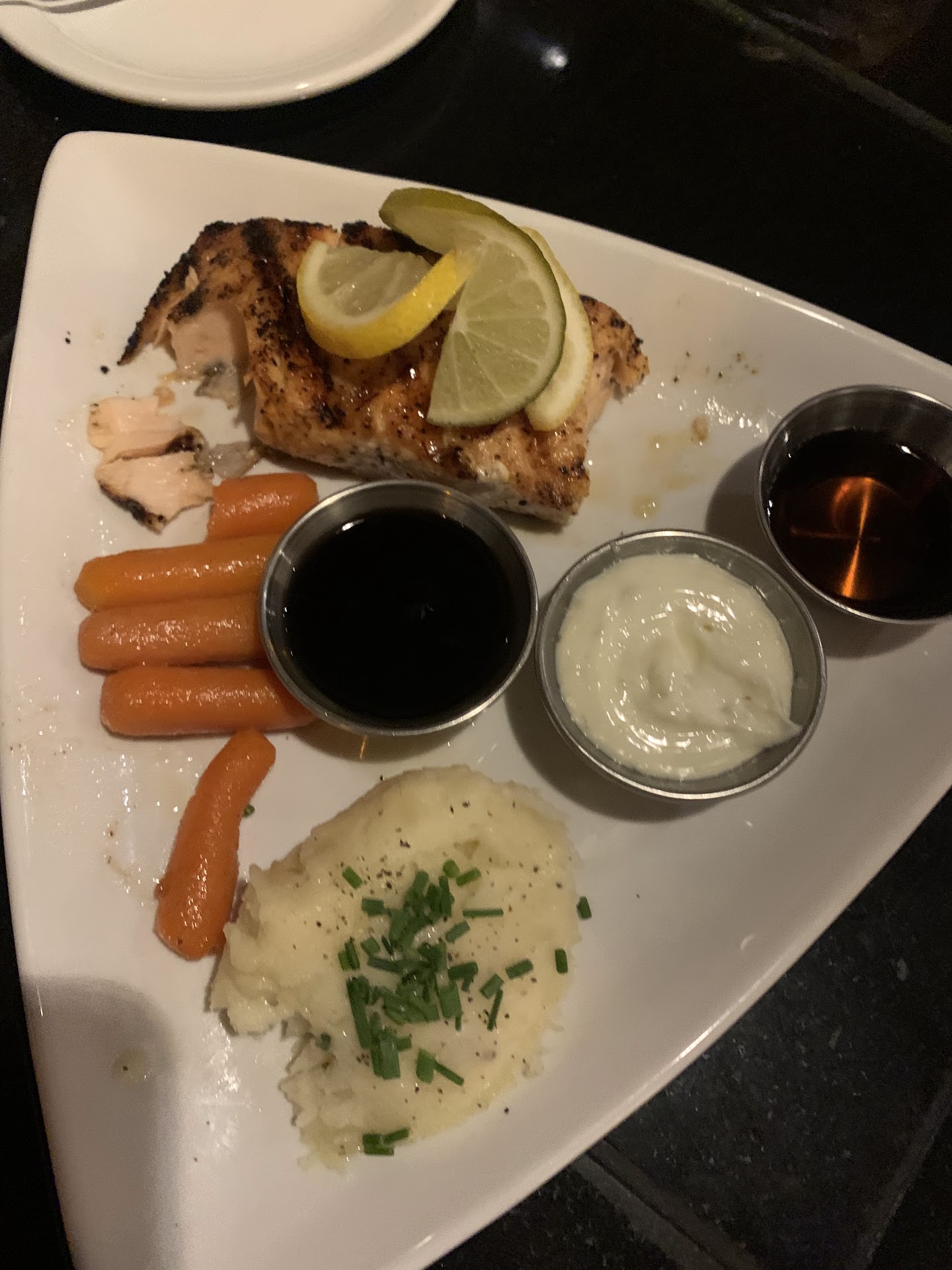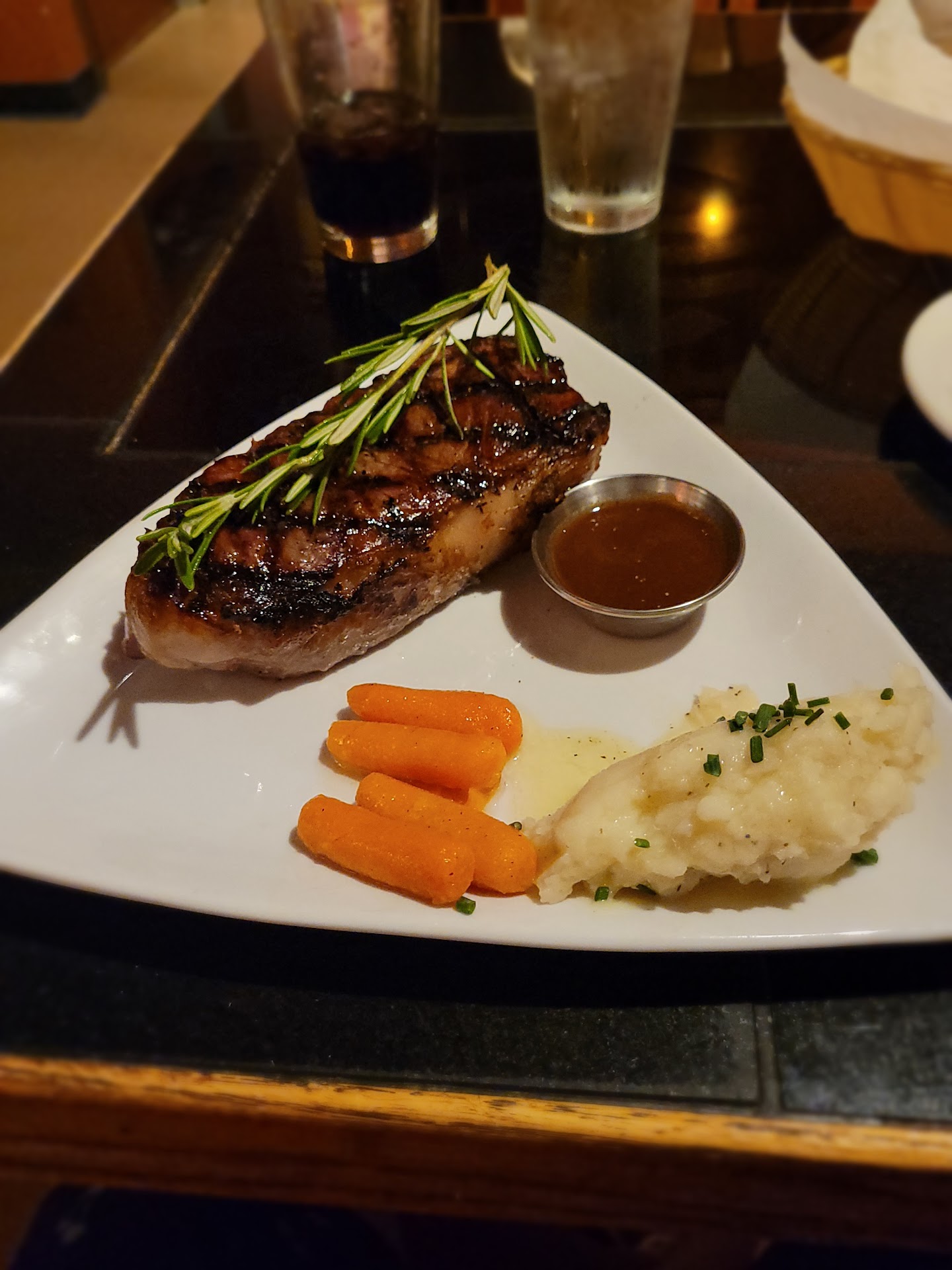 Our salads came next and the Caesar ones were supposed to have croutons but did not. Perhaps related to the bread issue? The Bison ribeye I ordered came out first. Our server said the rest of the meals would be right out. The next four meals came out 15-20 minutes later, then the last meal another 5 minutes after that. I was done with my meal before any other food came out, even with eating slowly.