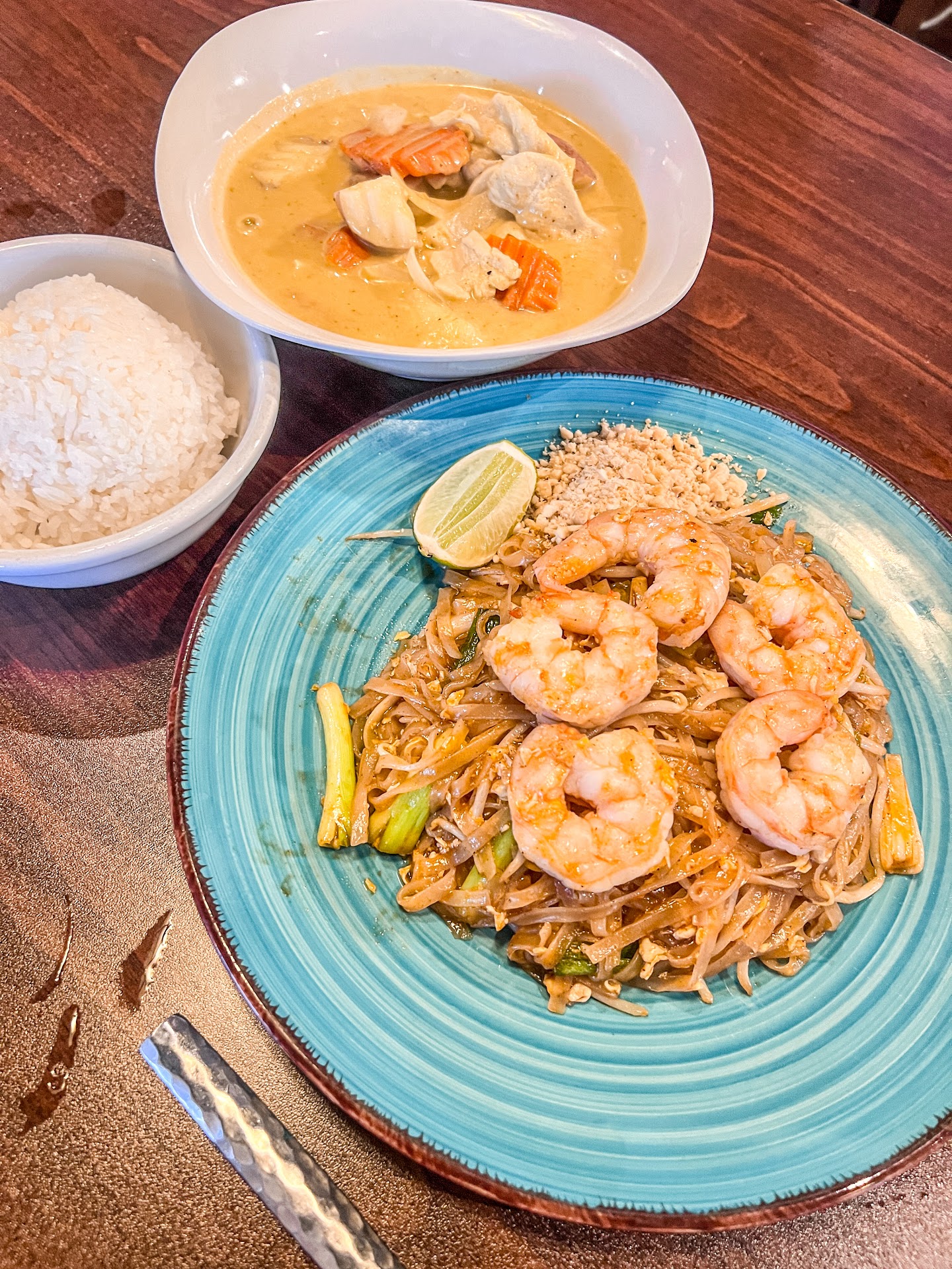 Fast forward to about 3 weeks ago, we decided to give Banana Blossom another shot. This time, we arrived to a completely empty restaurant where we weren't greeted when we walked in. We rang the little bell, but it still took about 5 minutes for someone to come up and greet us. We noticed that the decor seemed much more filled out, and the restaurant looked a lot nicer than our first visit. After being sat, we ordered the appetizer platter, Pad Thai and yellow curry. Since the restaurant was empty, we heard the kitchen complete our order, but it took an extra 10 minutes getting to us because our server appeared to be casually talking on the phone at the front of the restaurant while kicked back in a chair. When we got our appetizer platter, we very quickly realized that the spring rolls were the exact same mushy pre-frozen rolls that we had in our first experience. The crab rangoons, pot stickers, and coconut shrimp also tasted like they came straight from the frozen section at Walmart, which made us really disappointed that we spent close to $13 on it. The Pad Thai had less flavor this time, but it was still passable, just nothing special. The yellow curry however was much better than our first visit, and tasted much more flavorful.