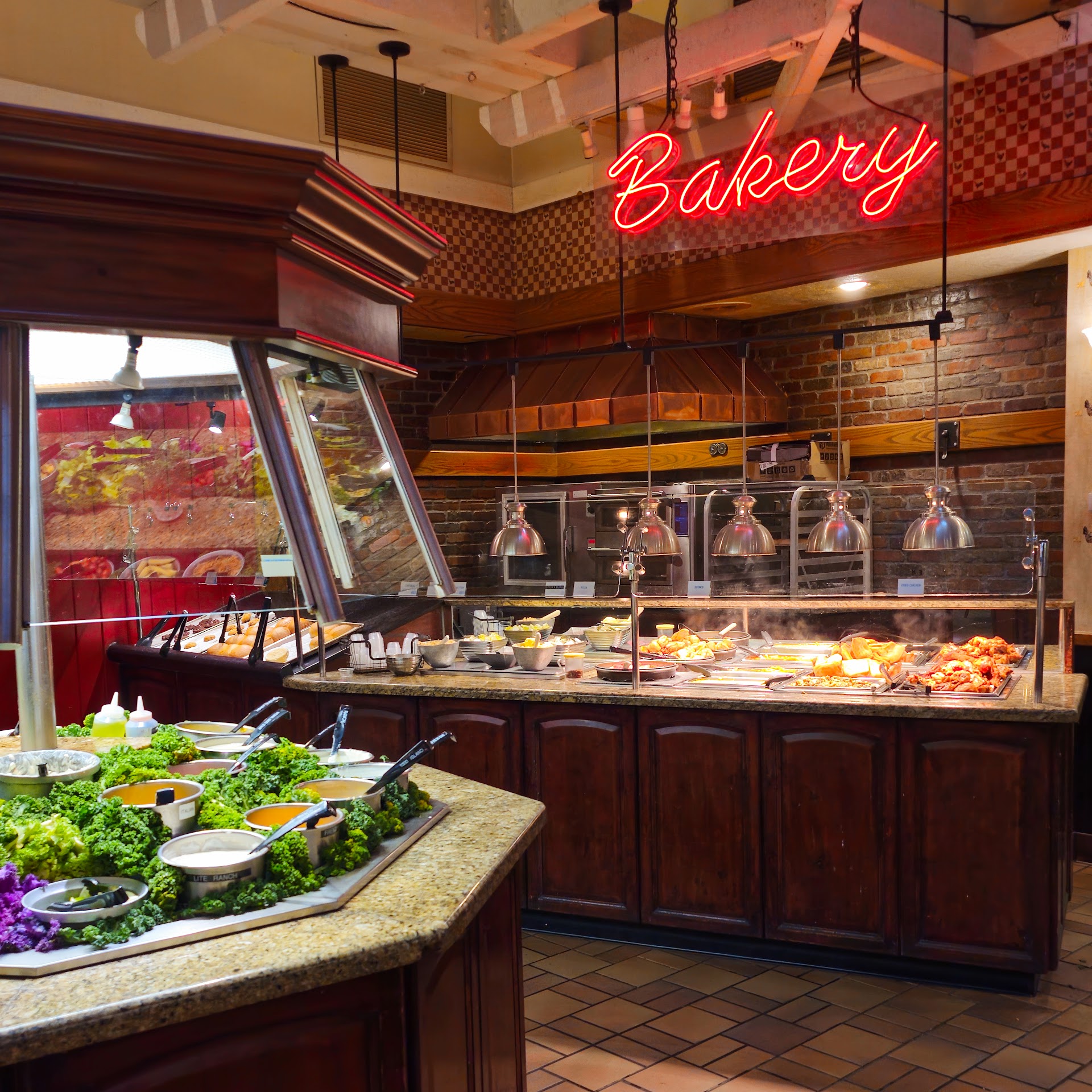 Parking at this location is AWEFUL. Easy enough to get in, but nightmare to park and then "exit" to road afterward. The food here is decent. You don't feel like you've eaten a lot of processed food when you're done, but, you're certainly not going to tell your friends this was a "tasty" place to eat! Ironically, the salad bar(s) are of the best parts of this buffet, tho most of the fares are poured from buckets into smaller containers for customers to scoop up. All of the dressings are fresh tasting, if not made in house. The chicken recipes are nice, tender and crispy when supposed to be. Their "Chinese" options are really, really bad! The rice is bloated and off color, never looking like it just came from a rice cooker, more like waxy maggots visually. Meatloaf and carving stations are fairly good. They serve an excellent cornbread, unfortunately it only comes out 4 slices at a time, so you're lucky to get some. Avoid pizza, french-fries and artificial honey packets. The rolls/buns are usually warm and buttery. Be prepared to pay approx $17 per person (includes drink), with tip $20+. Is it worth it? It depends: if you're in a hurry AND the parking lot isn't crammed full, AND you're hungry enough to mete the cost, then yes. However, if you're in your 20s-30s and like a more lively crowd, then no; try...