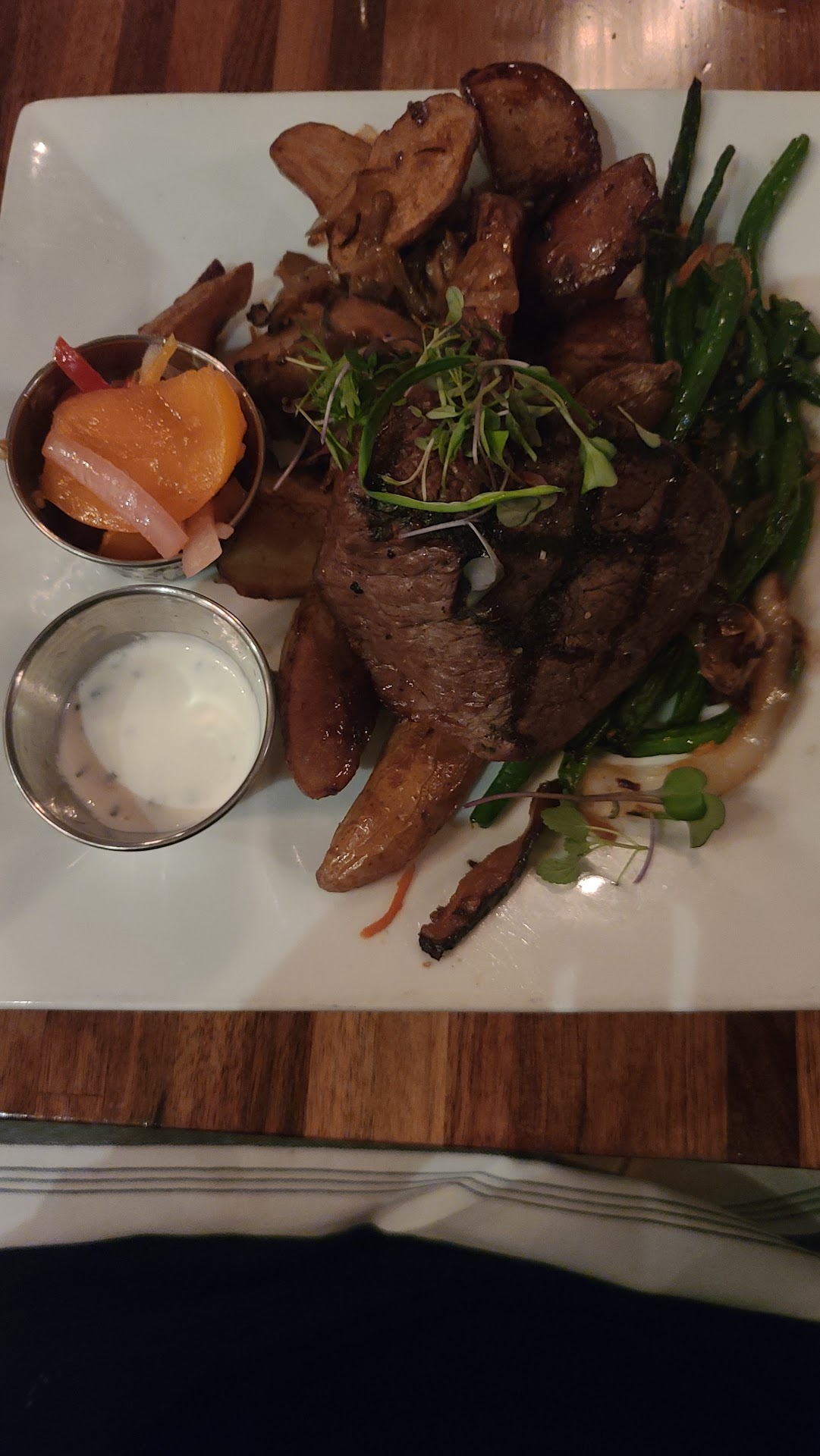 The ugly: I ordered a $56 ribeye with chimichurri butter on a bed of potatoes and Brussels sprouts. My first impression was âIâm surprised they donât include a nice side salad with this.â The steak was cooked well but was very bland. So much so I had to ask for steak sauce which I never do and salt/peppered it. Even then, it had very little flavor. I would have been disappointed at $18 let alone $56. Iâve never had a steak at Chilis or Outback that bland. I wish I had stayed home and had my wife cook one for me. The potatoes were ok but there were exactly two quarters of one Brussels sprout in total which after everything else was pretty comical. My father in law raved about the $6 limeade so I was very excited to give it a try as I generally love limeade. It too was underwhelming and rather bland. It look fun and delicious but left me wishing I hadnât ordered it. I ended up drinking more ice water than the limeade. My wife also didnât care for it much and together we drank just 3/4 of the glass.