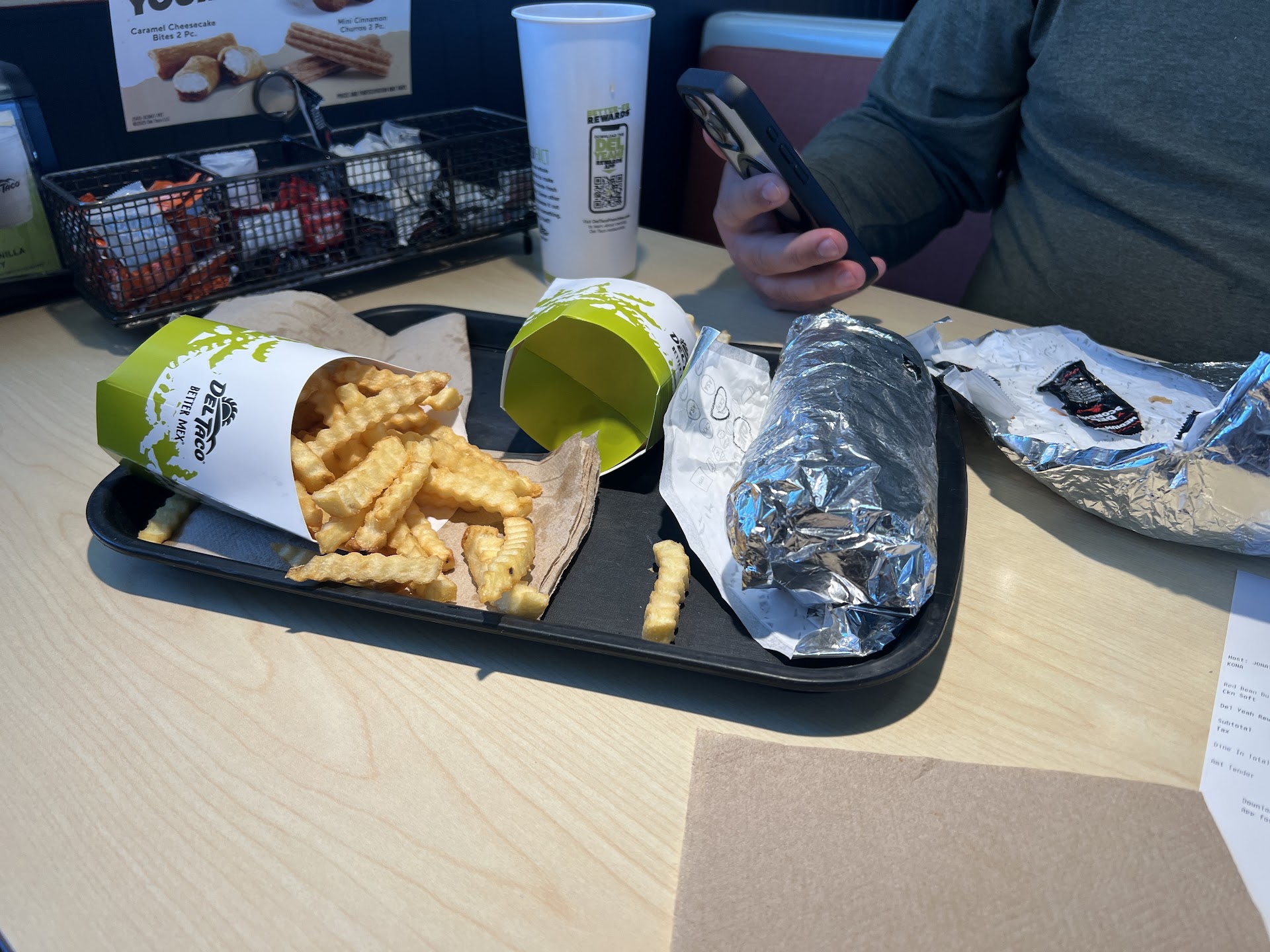 As a Midwesterner, I've only had DT once before on vacation 2017 in Lone Tree, CO — it was incredible. The food was amazing, the drive-through worker was hilarious and experience was unforgettable. Fast-forward to 2021, and I won't shut up to my fiancee about how magical Del Taco was. On our second to last night in town to visit Zion, we go for it. Our cashier is clearly on her first day and getting help from a trainer as she takes our order. It's fine. Food's ready in like five minutes and we're all good until — uh oh — we're missing my fiancee's spicy jack quesadilla. I let our cashier know, and she gets on it with the rest of the Del Taco team. Have a seat, they say. So we sit down and 5-10 minutes later we're about 90% through eating. I figure to ask at that point, and the worker asks around until they find it sitting somewhere in the kitchen? Not the best look. Two minutes later the trainer asks if we ever got our quesadilla. Honestly not sure it was worth waiting for. She didn't finish it.