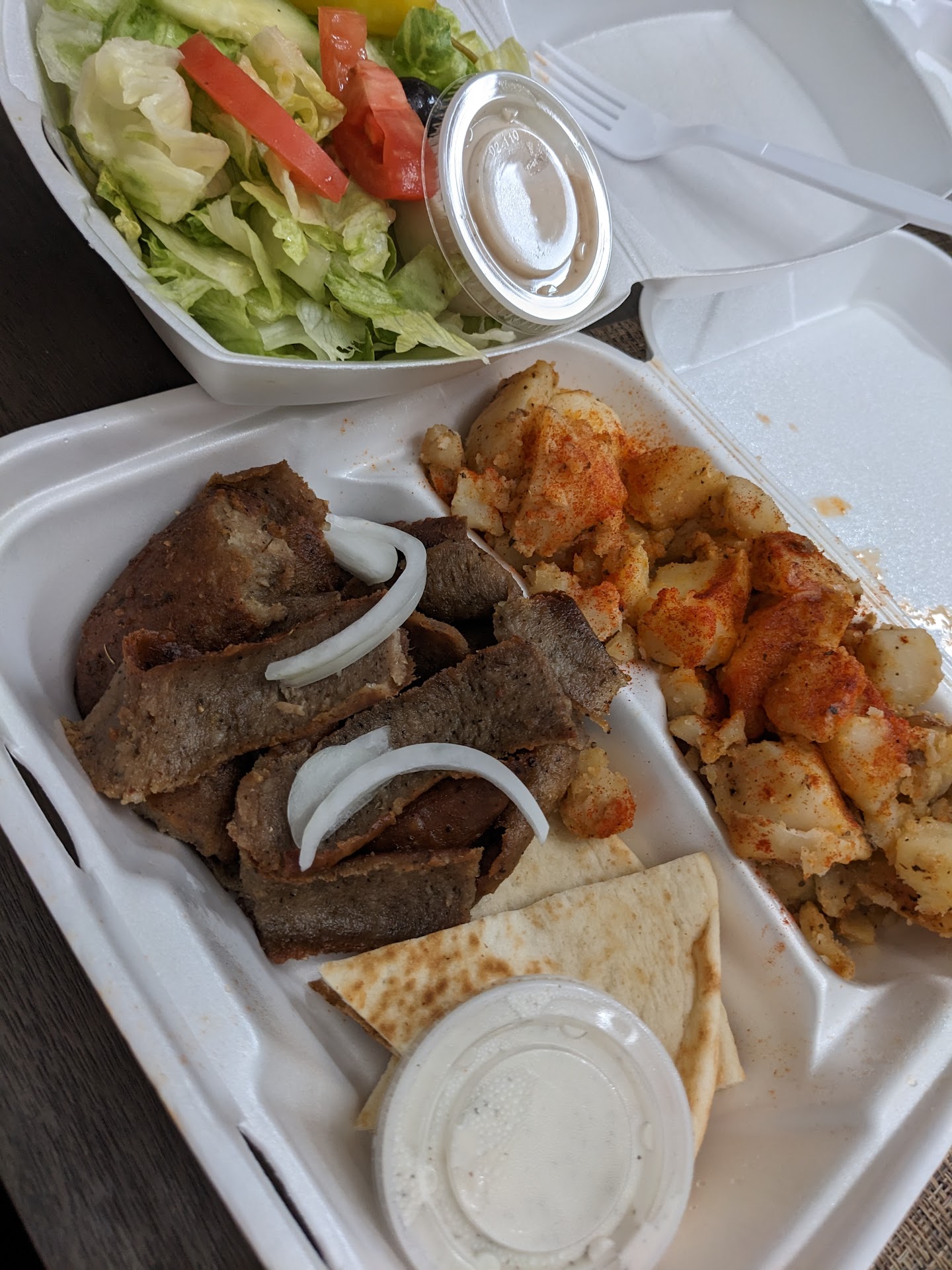 So nice to be greeted by friendly, smiling staff, who are happy to have your business. The food was great, and portions were larger than I thought they would be. I had the large Chicken & Rib Combo plate, which is 2 ribs and 1/2 chicken. It also comes with pita bread, a small salad, and one side. For the side, I chose baked beans. The beans were excellent, and it was a huge portion! The ribs were delicious - thick and meaty, seasoned very nicely but not too much, and cooked to melt-in-your-mouth perfection. The chicken was tender and flavorful, but not quite as juicy as the ribs. The salad was basic iceberg lettuce, one slice each of tomato and cucumber, one hot pepperoncini, and served with a little cup of tasty dressing on the side - not extravagant by any means, but added a nice touch. While there were no chunks of feta cheese in the salad, I could taste the feta in the dressing. By the time I finished, I was stuffed! I was surprised I got so much food for the price. I'm so happy to have more food options coming in to the west side of town, and definitely plan to return here to try other specialties. Can't wait to try the Gyros and Souvlakia! If they served Moussaka, I'd probably eat there...