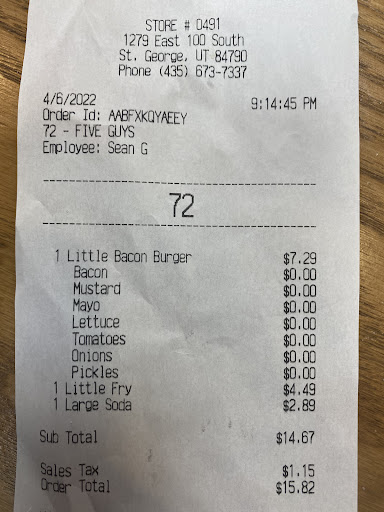 I worked at Five Guys for years and I love coming here every now and again. My husband and I just came to this location to test it out on boy did it disappoint. There were six crew members working on a Sunday at 4pm, no people in line before us and it took 15 min for them to get our order out. Max is 8 min, according to five guys protocol, I’d understand if they were busy but half of them were just standing around. The black shirt (manager) touched his face with gloves hands and went right on back preparing food. He should have his servsafe since he’s a manager, but clearly didn’t care. One of the staff said the “F” word loud enough for me and my young children to hear. My burger was made incorrectly too. Extra Mayo with no other sauce means extra Mayo on both top and bottom bun, they were just too lazy to even put any Mayo on my bottom bun, this is after I told the person who took my order that I know that it’s a ton of Mayo, which is what I wanted. She didn’t even communicate that to the staff prepping the buns. They forgot my bbq and hot sauce, and to top it all off, the fries were absolutely terrible. Looks like they aren’t doing their calibrations. Looks like I won’t be coming to this location again… I could keep going but I’ll spare the...