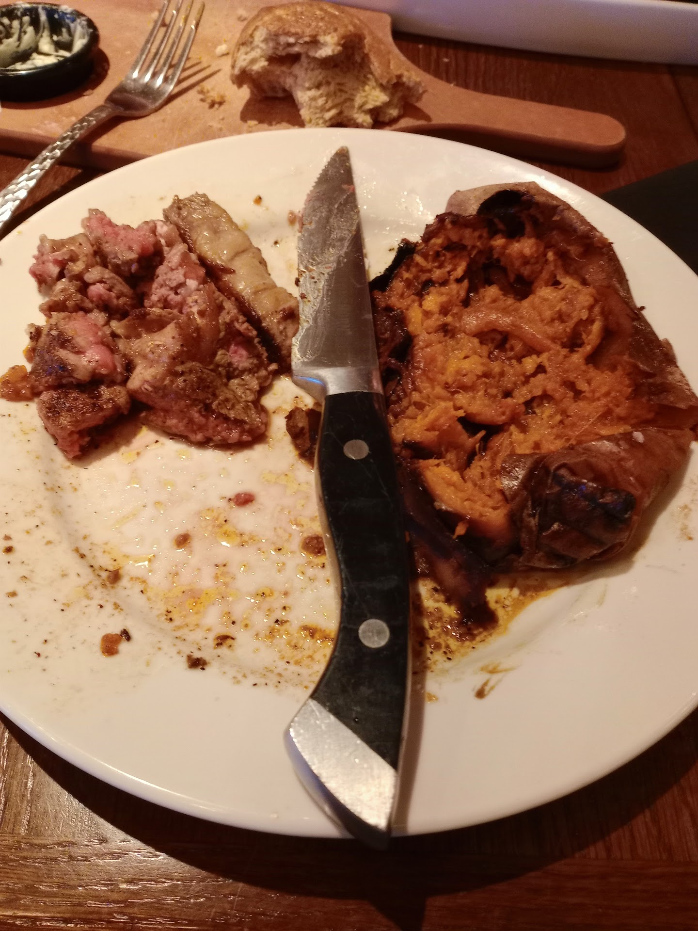 The mashed potatoes were delicious but mysterious because they were firm and yellowish even when hot (unlike potatoes that have a lot of butter only get firm when they cool off). And they had a lake of butter on top. I can't be sure, but the steak might have also had some butter involved because it didn't need any seasoning (normally a sign of a good steak).