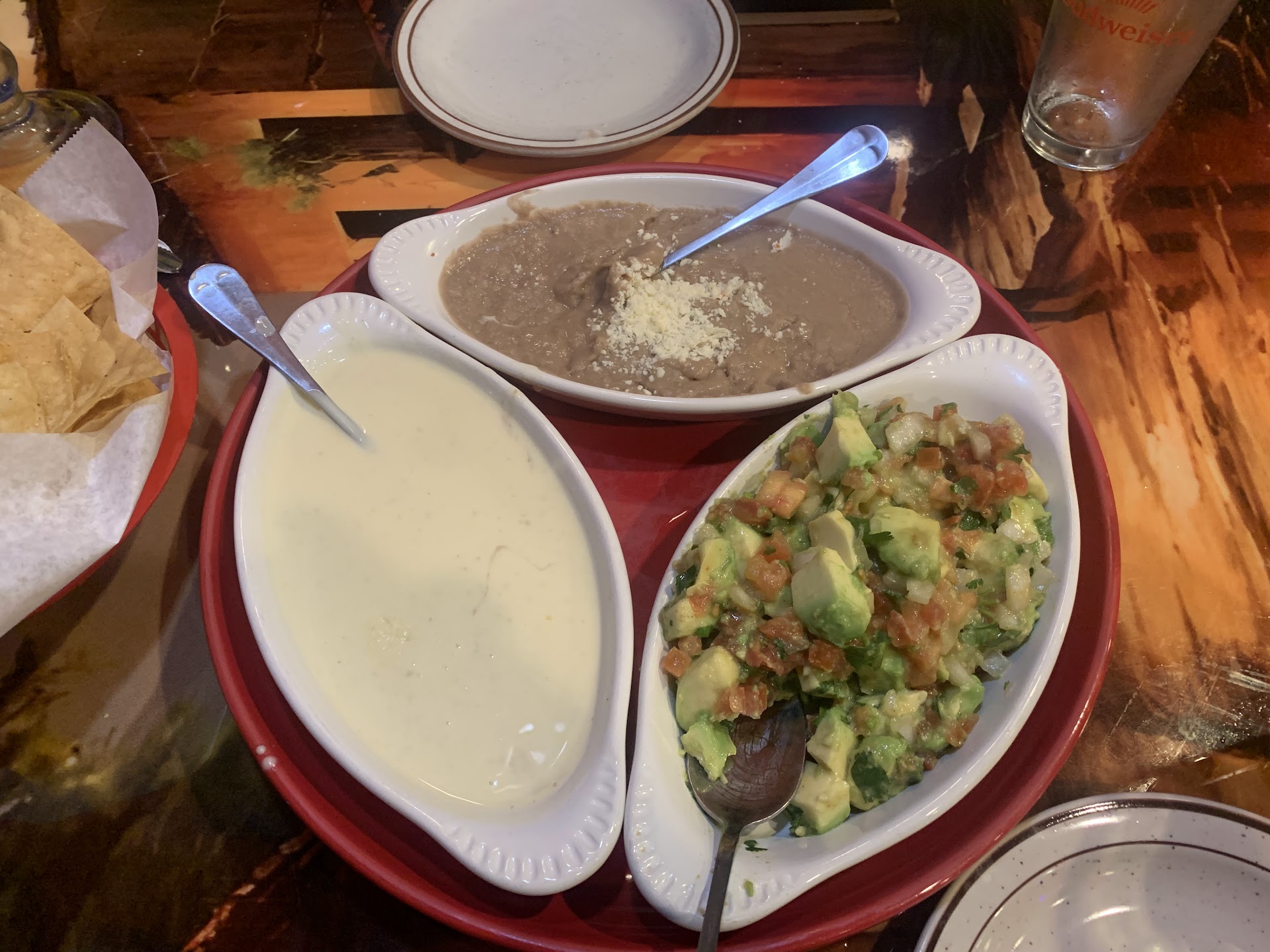 We had the Triple Dipper with white queso, guacamole dip & refried beans topped with cotija cheese and plenty of delicious homemade tortilla chips.
