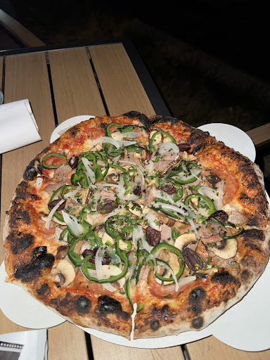 Back in college, i worked in a pizzeria next to a baseball stadium. When games would let out, we would get "slammed" by foot traffic. We would crank out flatbread in under a minute. The time it would take to stretch a ball of dough, assemble a pizza, and cook it in the 1000-1200°F wood-burning brick oven would be about 4 minutes, tops, from start to finish, maybe another minute or two before it hit the customer's table. We could cook up to 3 pizzas in the oven at once. We could crank out about 50 high quality artisan pizzas an hour. You could feel the heat on the customer's side of the counter. It was an inferno. I got no such vibe at this place.