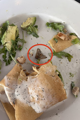 I had ordered one of their savory crepes and had gotten just about halfway through it when I got a solid surprise. I had cut a section off for my next bite and was pulling it apart when a moth fell out of the wrapped part of the crepe.
