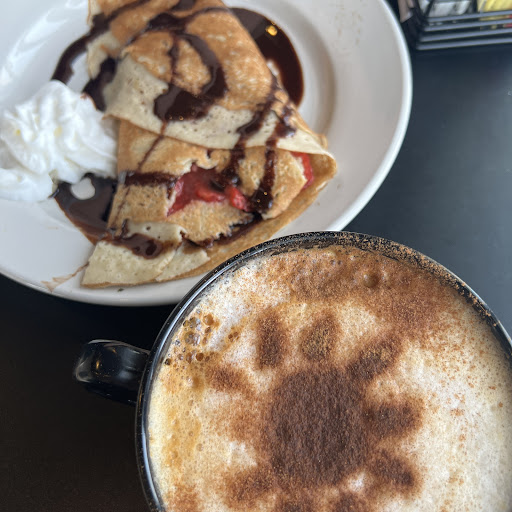The food arrived approximately 55 minutes after our arrival. Even though the restaurant was not busy at all. During that time we witnessed a couple in their baby come in, wait to be seated for more than 5 minutes, and after being completely ignored, they turned around and left the establishment. Someone in our group also wanted to order one of the breakfast crepes, and they were informed that they were out of eggs and asked if that was okay. The server said that they usually have a bunch of "cooked eggs things" sitting in back, but there weren't any there now. So, apparently, they don't even cook fresh eggs?