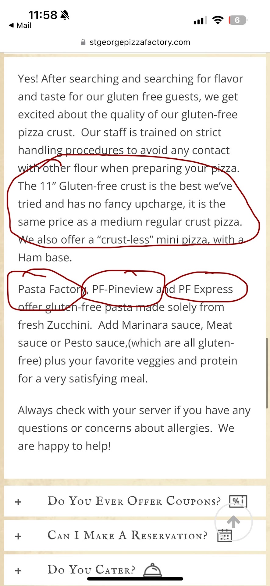 The company Iâm referring to is the website attached to this Google listing and I have attached screenshots of the section talking about gluten free options that are not o the menus. There is also a screenshot of the submit page after you enter your email for a coupon.