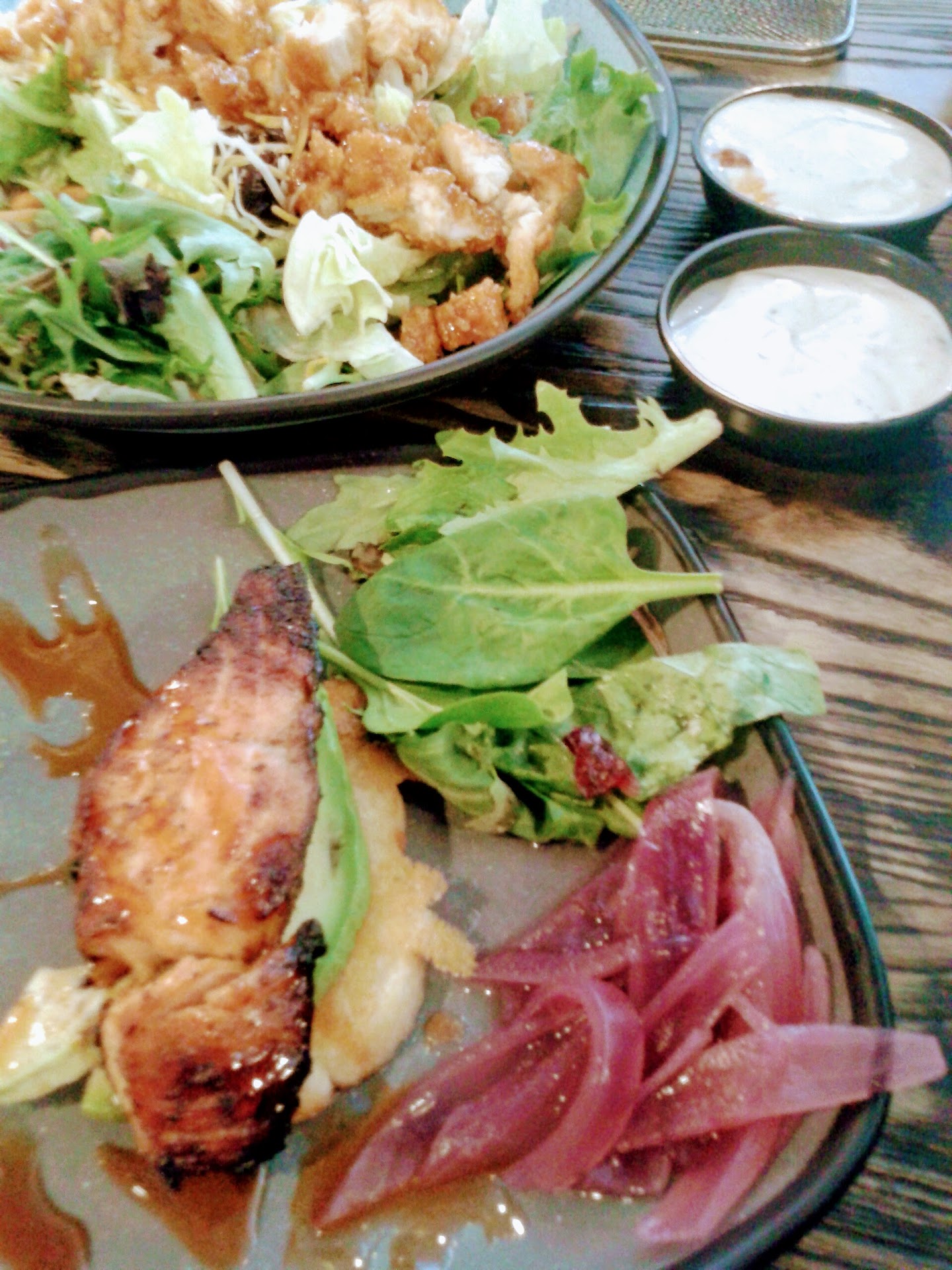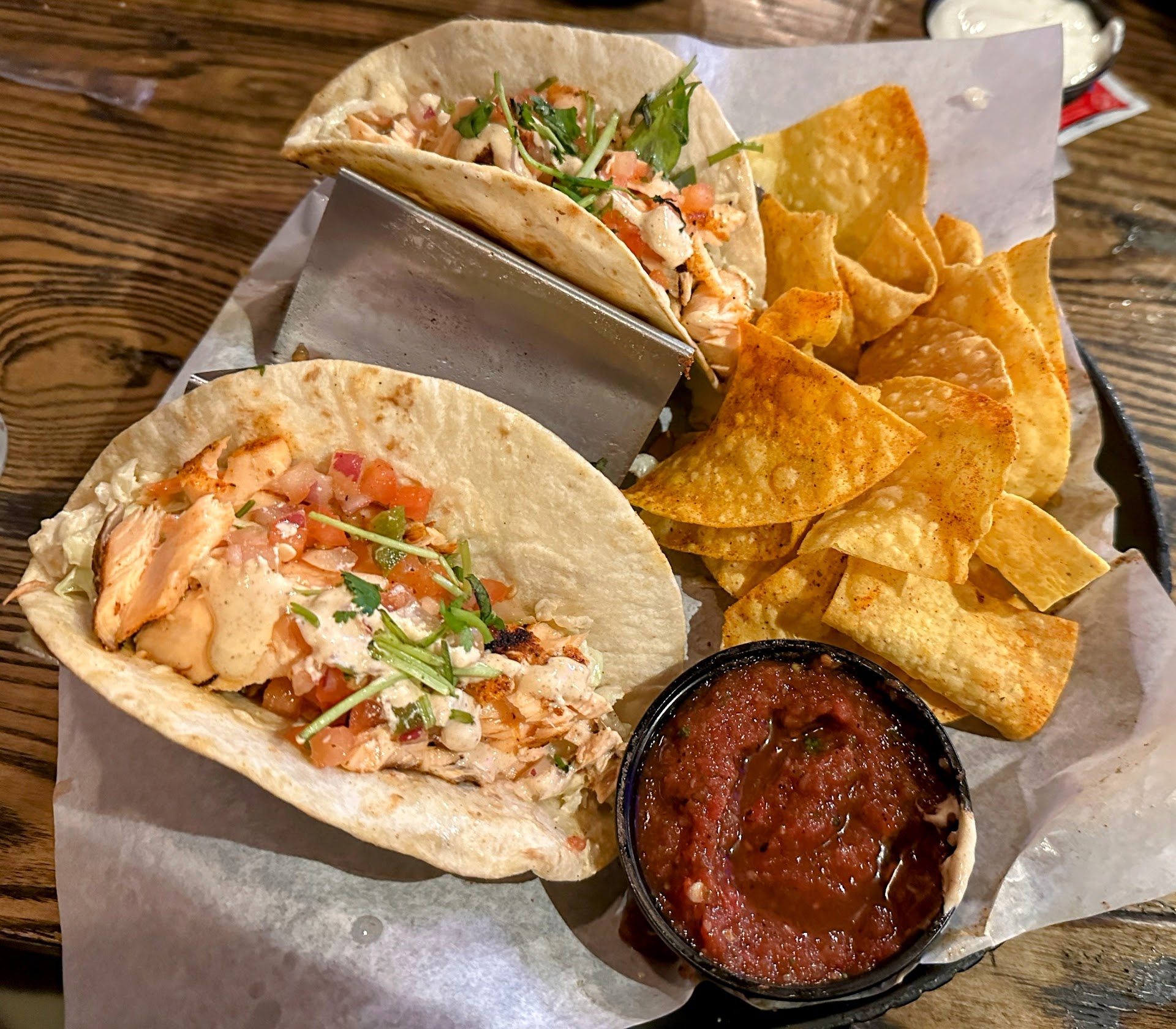 We got a sticky finger salad, which is a staple menu item for my family. Wingers has the best sticky fingers - their sauce is amazing and they are always cooked perfectly so they are tender and juicy. Combining that on a salad results in a good combination of meat and veggies. We ordered extra sticky finger meat in the salad and it didn't seem like we got it, so they either forgot, or shrinkflation hit Wingers too (we did get charged an extra $2.50 for it though). I had the salmon tacos, and they also had a great flavor. Salmon was a bit dry, but I wasn't expecting a wings restaurant to have exquisite salmon either. Last, we ordered the rosemary garlic fries, and they are to die for! Incredible flavor - they disappeared off the table FAST! They were a bit greasy, but that's probably intrinsic to how this particular dish is made.