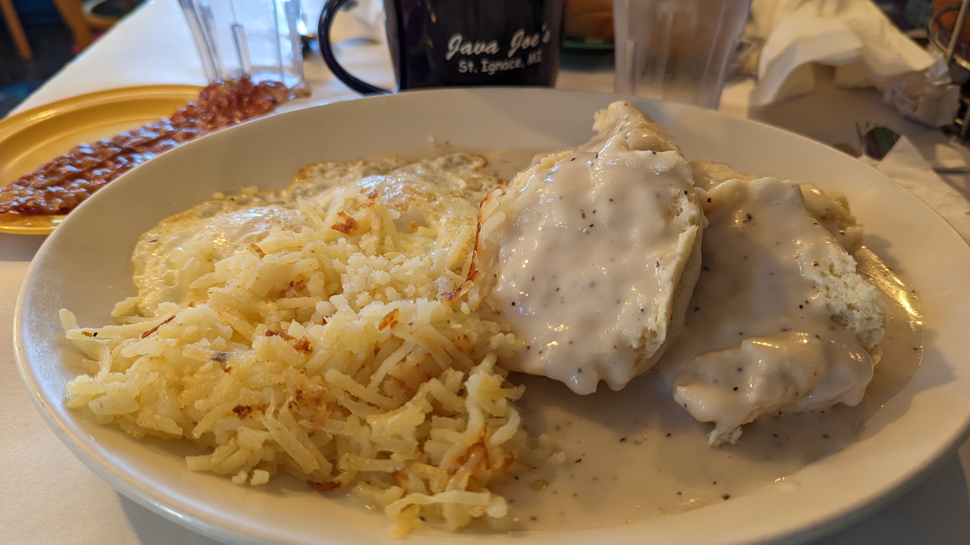If you follow my reviews, you'll notice a theme of me ordering biscuits & gravy pretty much everywhere I go. I'm probably even missing a few reviews, but will post them at some point. Anyways, I know my stuff. And, after doing the Bridge Run (just over 4 mi) & walking back (another 4-ish mi), I was fairly hungry, so ordered the biscuits & gravy, over easy eggs, hash browns, & bacon. I also had a chai latte to drink.