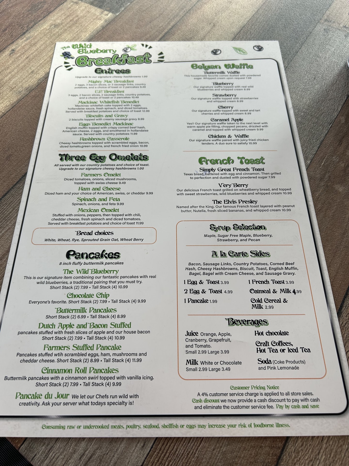 We were finally able to try this place out! We always noticed the lot was full early on & didn't realize they close by early afternoon (2:30pm). We stopped in close to noon (during off season) so it wasn't crazy busy, no wait. Friendly staff greeted us & seated us right away. The place is cute & clean! There were MANY choices on the menu that sounded amazing. The hubs opted for a classic style breakfast of eggs, bacon, potatoes & blueberry pancakes. I ordered their stuffed pancakes, it was their Farmers stuffed pancakes that had ham, cheese, potatoes and mushrooms. My brain kinda of thought of stuffed French toast, like the goods would be sandwiched between the pancakes... it's literally in the batter! It was good, just a surprise. And the pancakes are HUGE! Like 8 inch giants. They also have blueberry coffee, which is one of my absolute favorites! It's not the fake syrupy stuff either, it's legit blueberry & it is delicious. They also have specialty coffees & if you're a coffee snob, we find it's hard to find a decent cappuccino or macchiato anywhere in the area. Well, our waitress made a delicious caramel macchiato. It was so yummy that we decided this was going to be our quick coffee stop before the bridge when we leave, as they have a whole bakery/to-go area right up front. On the day we headed home, we made our stop. Same super friendly service as the first visit. We get our to-go treats (cinnamon roll & blueberry muffin) and order our coffees, one blueberry coffee and one caramel macchiato. It was quick & easy & off we go! The coffee was much too hot to try before leaving so we gave them a few miles after the bridge & hubby takes a drink of his macchiato & it's super sweet. Noting like he had the day before. I tried it as well & it was nothing but hot caramel & milk. My coffee was fine as it's their usual however, it's nothing they are able to control, but I ended up with a faulty paper cup that had a slow seep, lol. We dumped his drink out & slid my cup in for a catch all. We didn't try our treats until we got home, which may have been a good thing. The blueberry muffin was good but it was SO crumbly. If you tried to break a piece off, it just fell apart into crumbs everywhere. I didn't try the cinnamon roll myself but if my hubby didn't like a cinnamon roll, that's practically unheard of! He didn't care for it. He even warmed it up. Said it was too spongey. I took his word & didn't bother.
