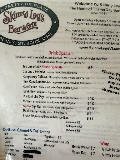 Read moreSo our Skinny Legs trip was kind of an accident – we drove all the way over to Salt Pond Beach b/c it was raining in Cruz Bay and we were told the “dry” side of the island is always better when that happened. It was raining harder at Salt Pond by the time we got there! So rather than trek down a muddy trail and sit in the rain, we backtracked for lunch at Skinny Legs. We weren’t the only ones with that idea; the place was heaving. Fortunately they have a lot of parking, we kind of wedged our jeep between two boat trailers in the harbor parking lot next door. After tracking down the guy who had the waitlist (turned out to be the owner!) we tucked ourselves away in a corner of the bar with a couple of beers and waited for our table. As we watched the staff bob and weave through the hectic crowd, it occurred to me that they all seemed to have really good attitudes for being as busy as they were. The bartender always delivered our beers with an unhurried smile, even though he had a stack of drink orders. The waitstaff very politely excused themselves as they zipped around the space. It was really impressive. We finally sat down after about a half-hour wait (which is what we were quoted). The service continued to be friendly and relaxed, and the burgers were ah-may-zing! Very happy the weather gave us an excuse to try Skinny Legs; it will be definitely be on our must-visit list next time we’re...