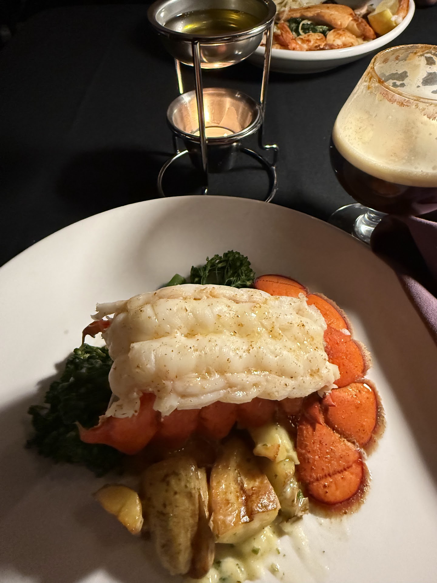 For the entree, I had the One Lobster Dinner. Right away after tasting it, I wished I ordered 2 because it was perfection! It was perfectly cooked, where it was sweet, tender, bouncy, and juicy! The clarified butter came in its own stand with a tea light candle right below it to keep it nice and warm!