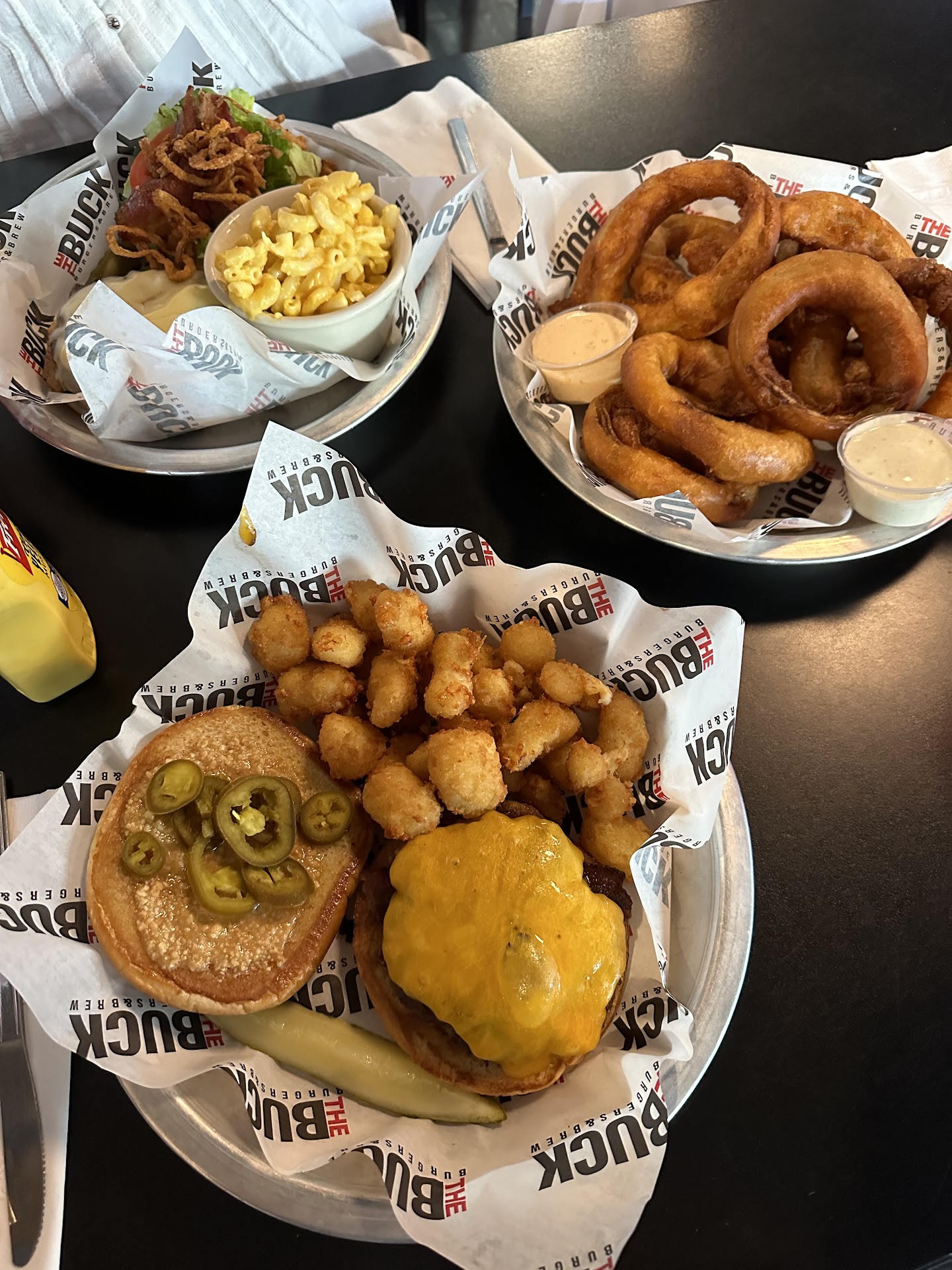 We ordered our waters, and I then asked to try the blood orange, blond ale Which I did get, but was a very small amount basically a sip. We then ordered, the Buck burger cooked medium with mac & cheese upgrade, and the peanut butter and jelly burger cooked medium as well with cheese curds upgrade, and a side of onion rings to eat with the meal. Took at least 15 minutes just to get our waters, and then another 25 minutes or so to get our food.