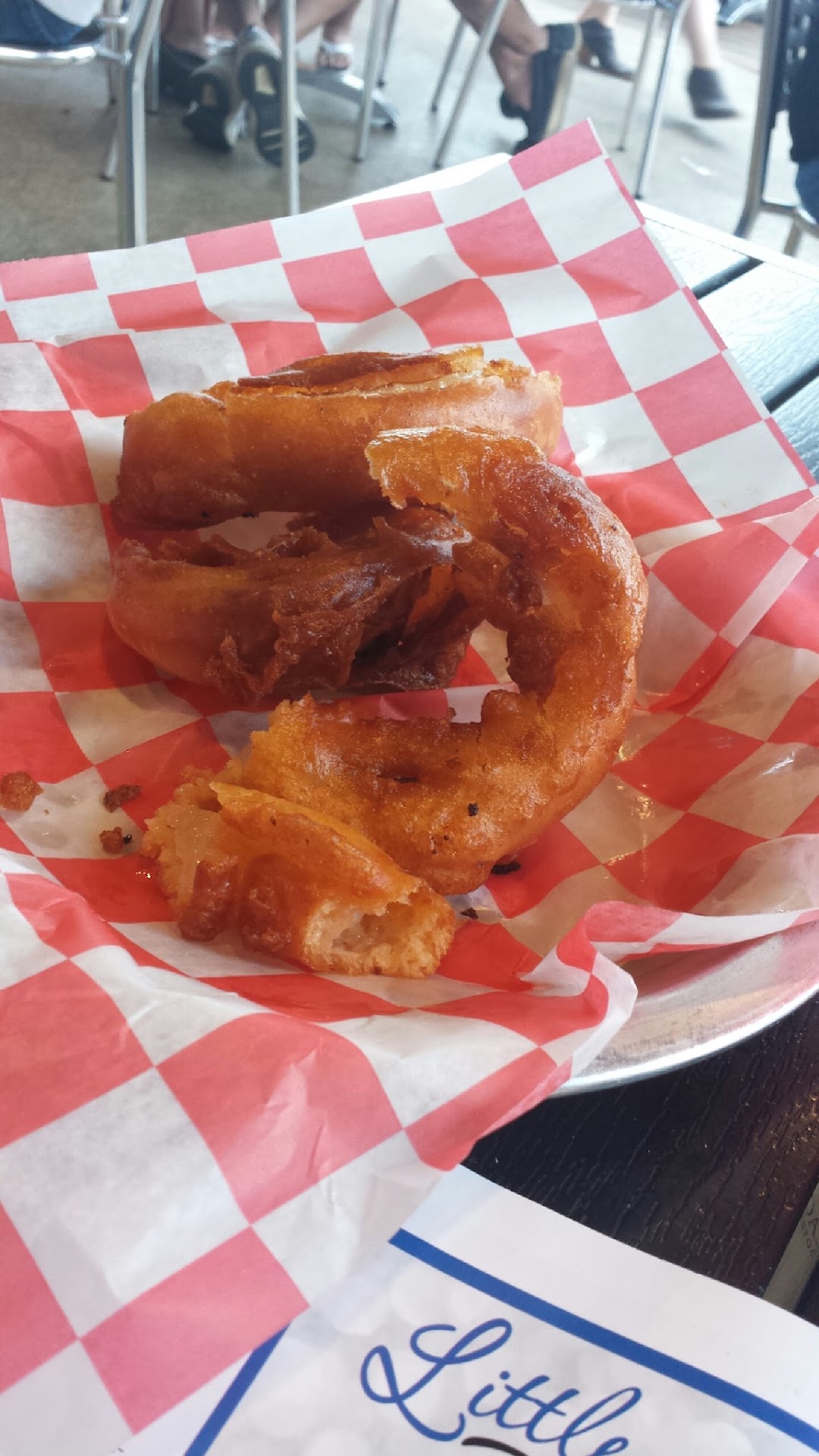 The onion rings were the worst we’ve ever had. They were doughy almost like doughnut, but fried, lots and lots of grease. The cheese curds were the same way with almost no cheese, and just a bunch of fried. The mac & cheese tasted like box mix very dry as well. Both burgers seemed dry even though they were both cooked medium, and the patty was very small with lots of lots of bread. Too much bun for the burger itself. Picked around most of the bread to try to eat the meat. Didn’t touch the mac & cheese other than the one bite and maybe had four cheese curds total.