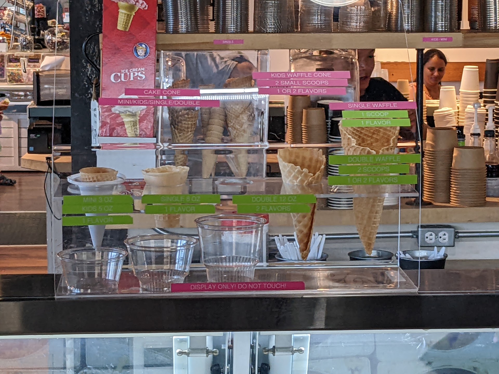 In the end my daughter got herself a waffle cone with some chocolate flavor and loved it, my husband settled on a waffle cone with vanilla because he was feeling rushed and was having a hard time getting his questions answered, and I went with a cup with two different flavors in it. Sadly the bottom ice cream in my cup was already melting before it made it to my hands so it wasn’t very good when I got to it so I ended up throwing...