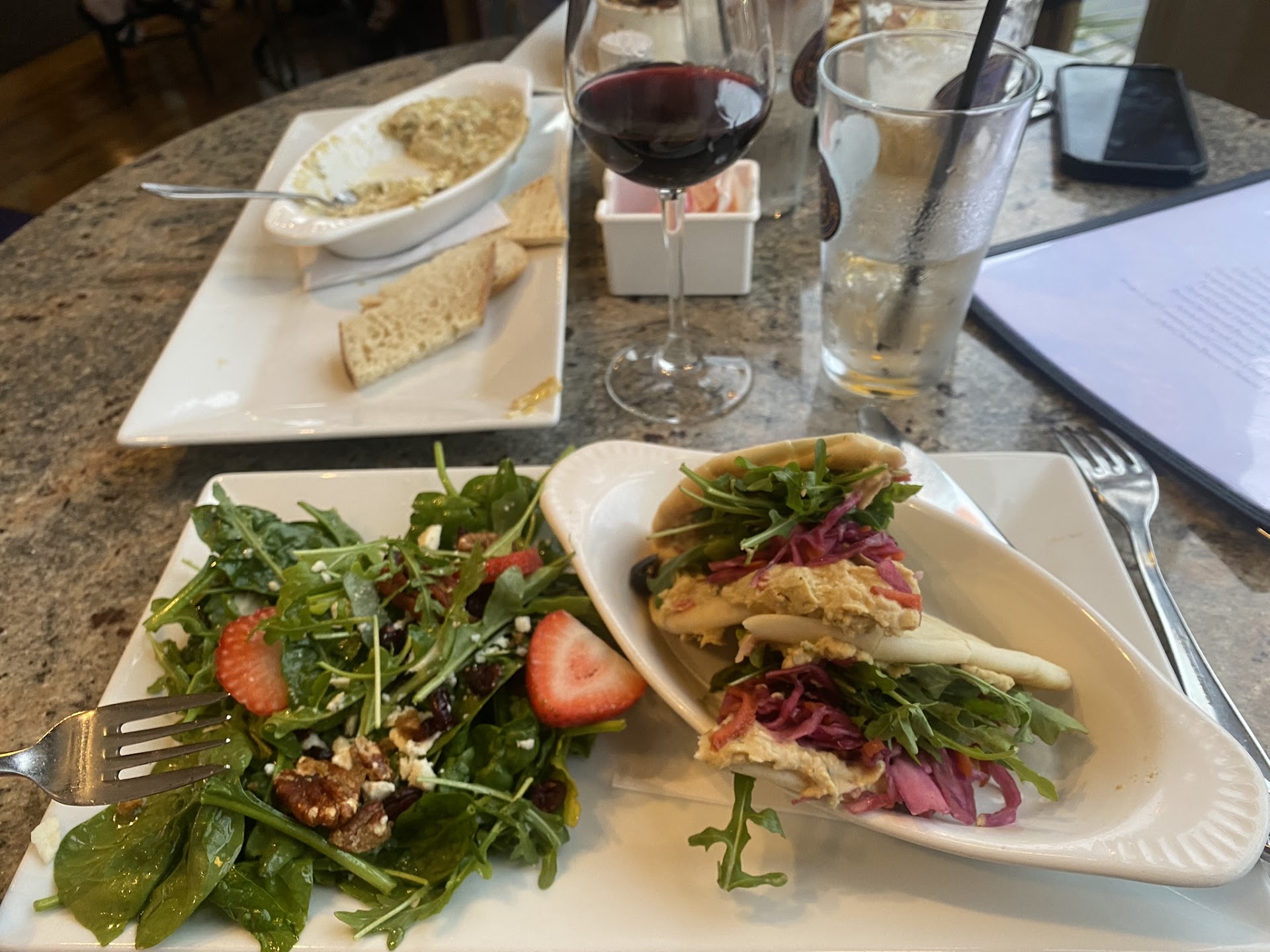 As to the food, we had the vegan shepherd’s pie and the vegan curry, with sides being split pea soup and hummus with pita. Unfortunately I had to send the shepherd’s pie back to the kitchen to be heated up as it was cold in the middle. I did enjoy the split pea soup and the curry was nice, but the rice that came with the curry was dried out and the pita that came with the hummus was served cold, which was somewhat disappointing.