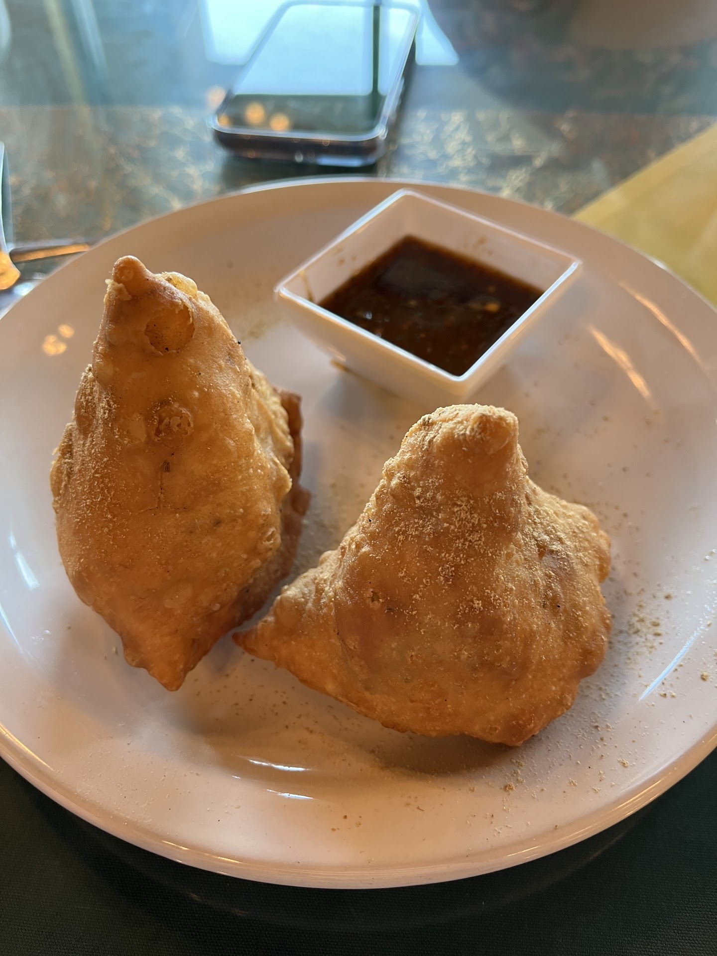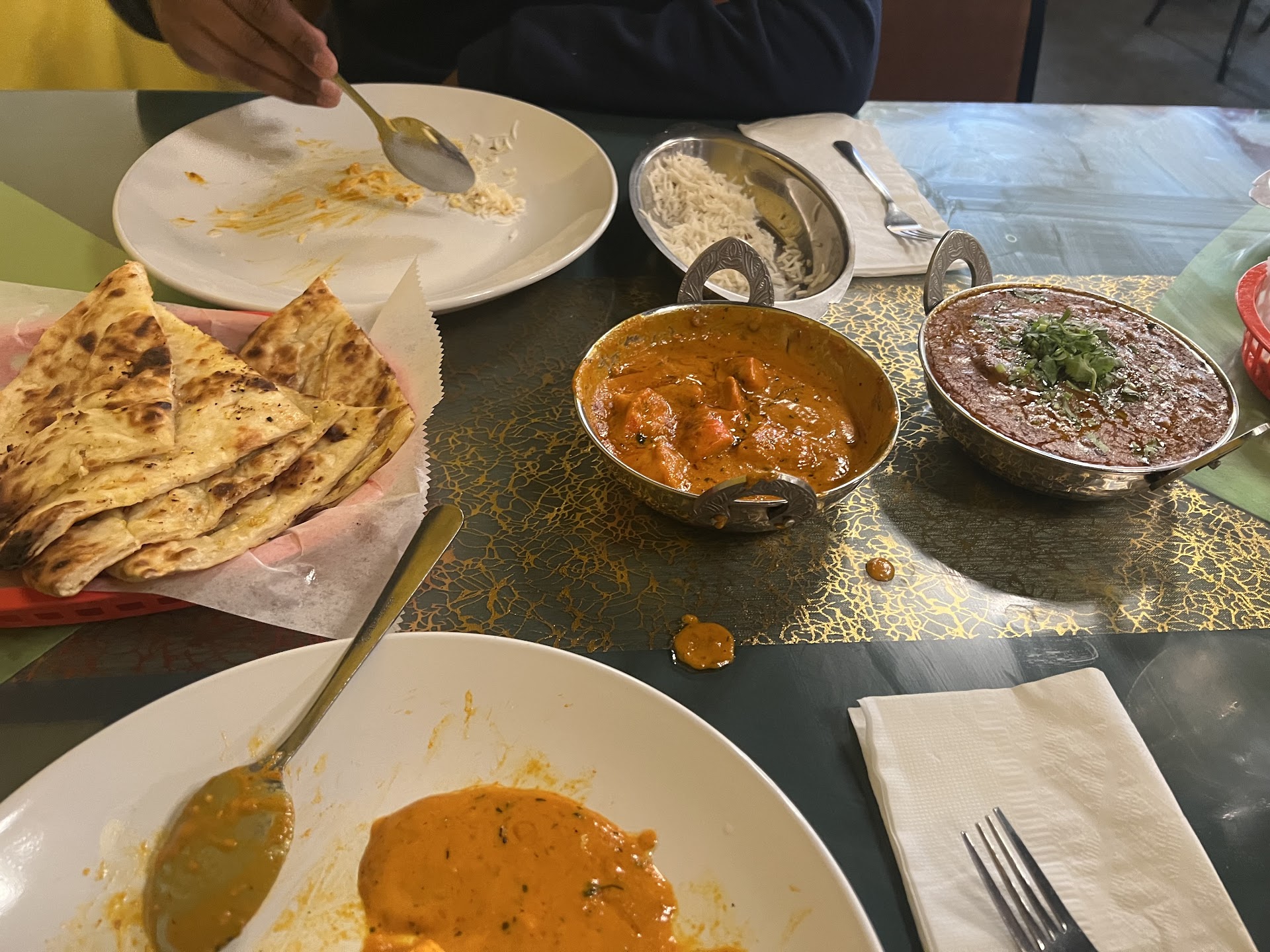 We ordered goat curry medium spicy, goat korma medium spicy, garlic naan, and vegetable pakora. Garlic naan was phenomenal. The vegetable pakora was the best I have ever had! I broke open a few of the larger ones and fed the insides to my daughter and she gobbled it up spinach and all.
