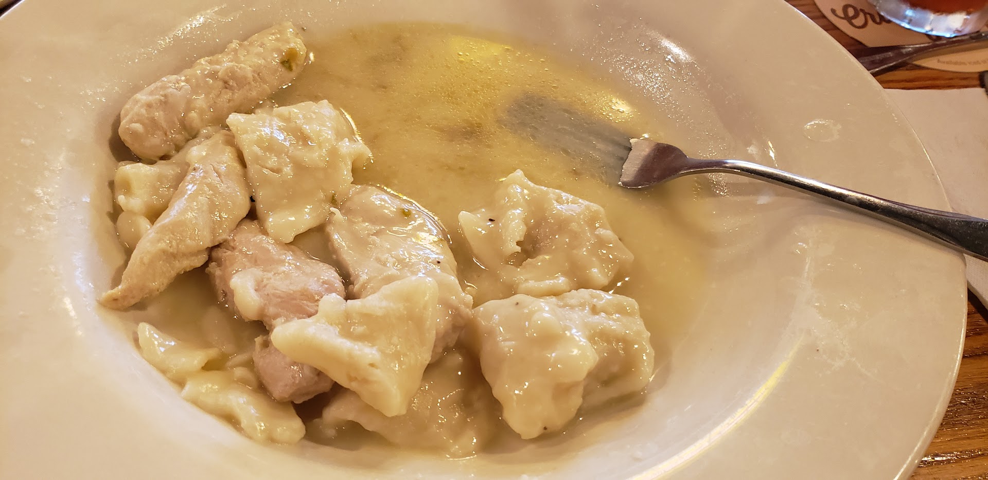 Today, I received a liquidy mess. The broth for the chicken and dumplings was thin, and I searched to make sure I had chicken. Angie, our waitress, came by and asked as she passed going to another table, something like "Is everything ok?" I raised my voice and said, "Truthfully?!" But she left that table and went back to the kitchen another way.