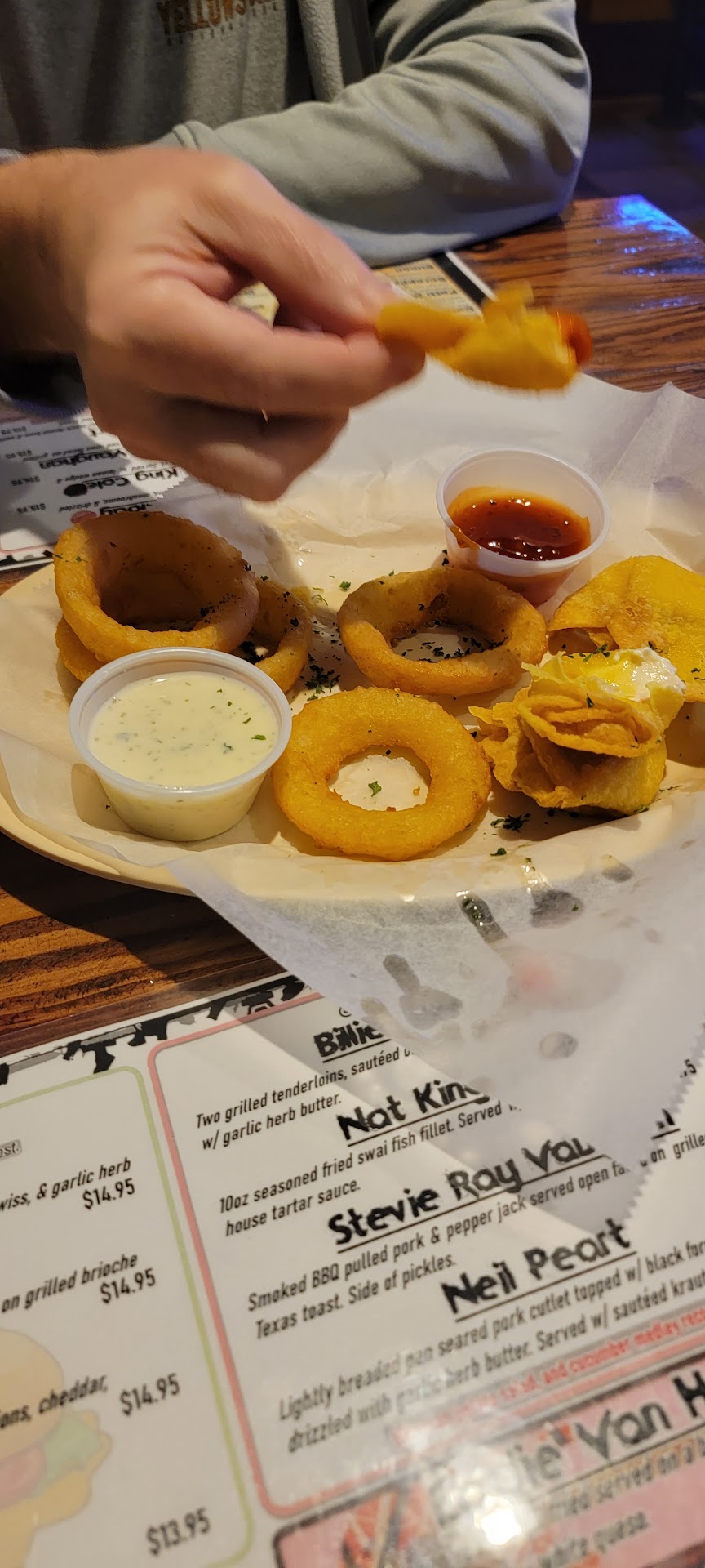 Our food looked great & was temperate. Fries were a rather small pile (can you even see them behind my bun?!?) & burger was a none too big (think smallest cheap McDs burger sz) pre-frozen perfectly round type when it should have crispy edged crafty patties to fit their trendy menu. Buns were suuuper puffy brioche and nice. My bfs meal was really yummy looking, but eating it with the several inch long strings of BBQd meat atop a crispy tenderloin, proved to be a chore 🤣! Impossible to chew through the BBQ meat and the sandwich just slipped and pulled apart in clumps. But yummy 🤷♀️.