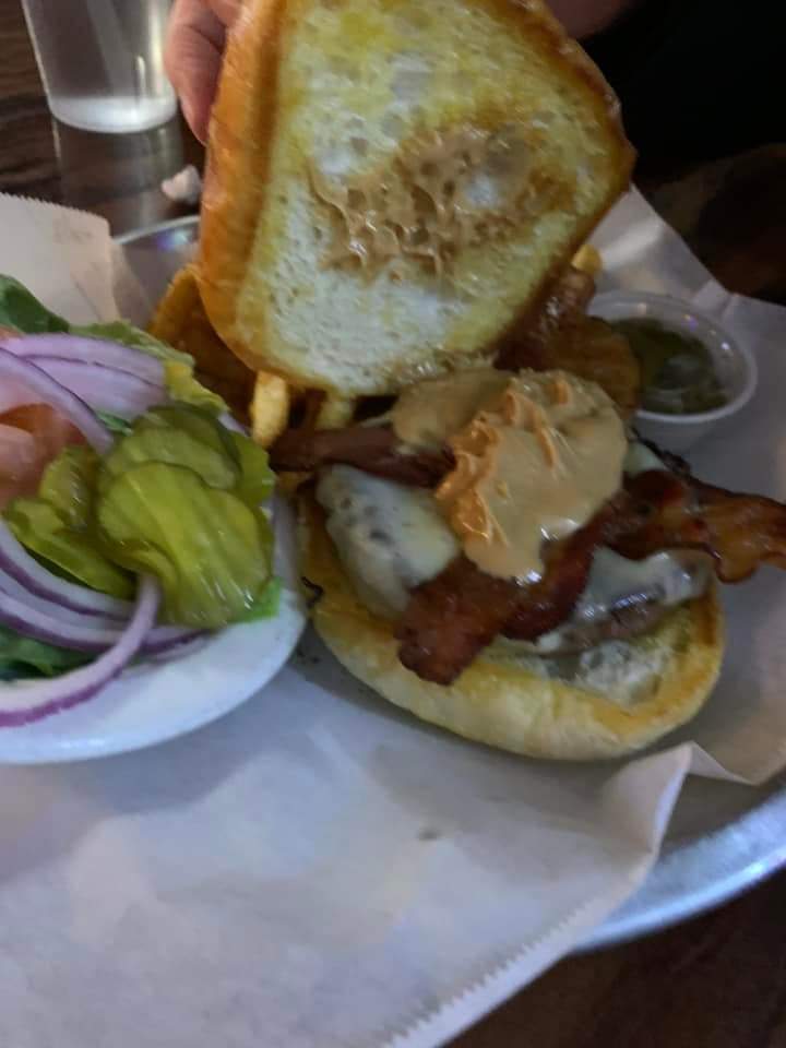 Our food looked great & was temperate. Fries were a rather small pile (can you even see them behind my bun?!?) & burger was a none too big (think smallest cheap McDs burger sz) pre-frozen perfectly round type when it should have crispy edged crafty patties to fit their trendy menu. Buns were suuuper puffy brioche and nice. My bfs meal was really yummy looking, but eating it with the several inch long strings of BBQd meat atop a crispy tenderloin, proved to be a chore 🤣! Impossible to chew through the BBQ meat and the sandwich just slipped and pulled apart in clumps. But yummy 🤷♀️.