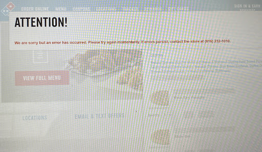 Read moreThe âmanagerâ was rude and unhelpful. The GM told me the website was working fine for everyone else and he doesnât work in IT. Then he hung up on me. I got this same error message for over an hour. I was asking them to price match the online price because the website was not working for me. It was $5 on a $57 order. Until today we ordered pizza from there frequently. The last few times it had been very salty so the place that we ordered from instead tonight ended up being a better fit for us anyway. Iâm attaching a picture with the error below. It definitely wasnât letting me place the order even after I waited and...