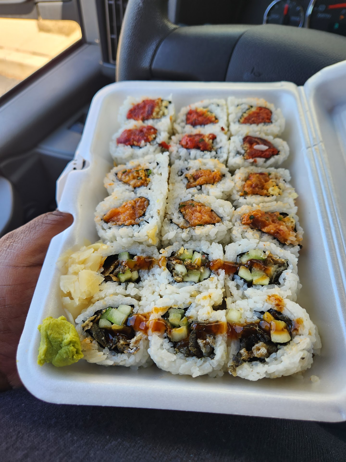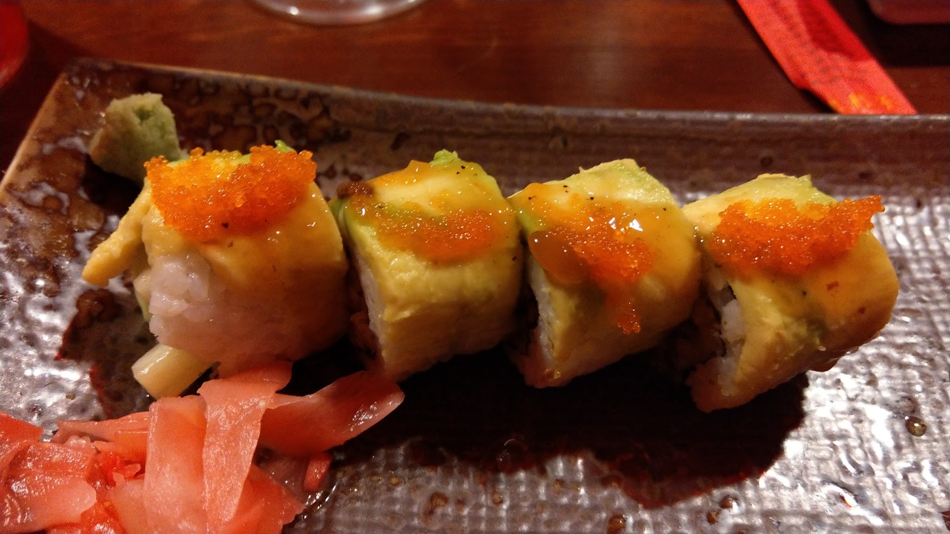 I got two of my rolls first. Salmon avocado and California. I thought the California tasted slightly off but thought it was just me. The salmon avocado was better - less of a rice sitting too close to bananas taste. But still not what I'm accustomed to.