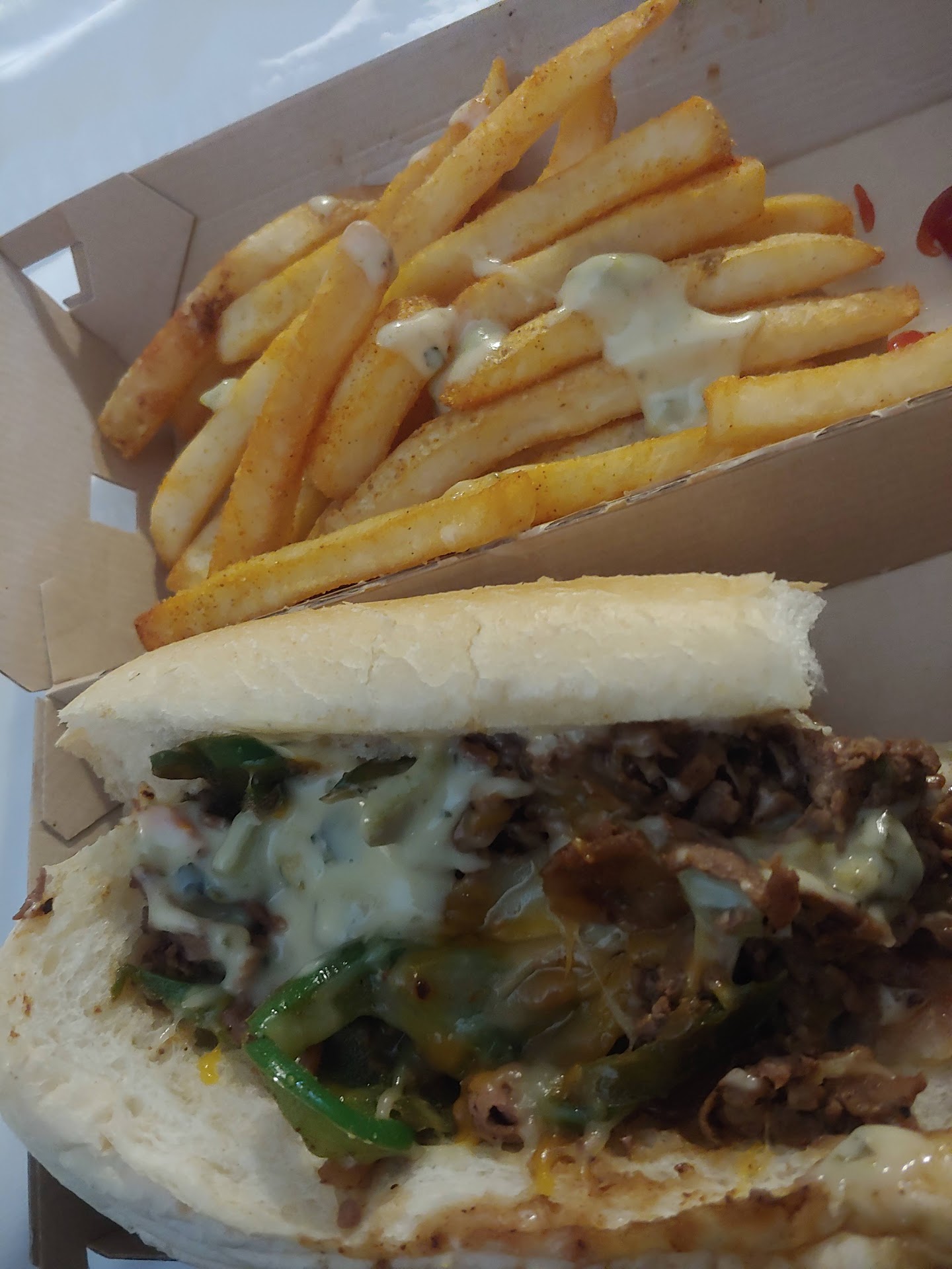 Okay, why the one star? I got the philly cheese steak which I thought was cooked well 🤢 The young lady added what looked to be day-old soggy tomatoes to my sandwich, and of course, instead of being impolite or wanting to cause a scene to tell her to take it off. I just accepted it, since service was already beyond slow and there were only two people working. WRONG MISTAKE❗ I was sick for literally 3 days, which I'm sure was either salmonella poisoning. The awful feeling I felt during those three days were so horrendous, I wouldn't wish I on my worse enemy. If you care anything about your health, stay away from this place or ensure that your meat is properly cooked and the veggies are fresh to date. Oh yeah, and the fries had so much seasoning salt on them, I couldn't even finish them. Thankfully, I didn't even want to. For those of you with high blood pressure, definitely don't order...