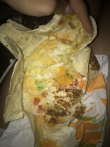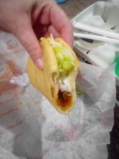 Well, another disappointing experience. I understand skimping a little on the $1.00 menu items. I don't expect much for that price. ;) But I just paid 5 bucks (an additional .80 for "steak"), and this was the end result. There's no way in hell that the contents in this thing was steak. It honestly looked/tasted like ground meat. That, or they chopped up, and ground the ever living hell out of the old pieces of the steak meat leftover from the past week. I even proceeded to ask the server if he was sure that it was a steak burrito. To which he replied, "Yes". It was as big as a $1.00 cheesy, bean, and rice burrito. They always seem to fill their food with 1 to 2/3'rds of the way with sauce than any actual filling. My husband couldn't eat the rest because it was so saucy. I'm not usually picky, but I am unkind to getting ripped off. I understand it's Taco Bell, but honestly, you might as well go to a Chipotle for that price. And that's saying something. =P At least the cashier was...