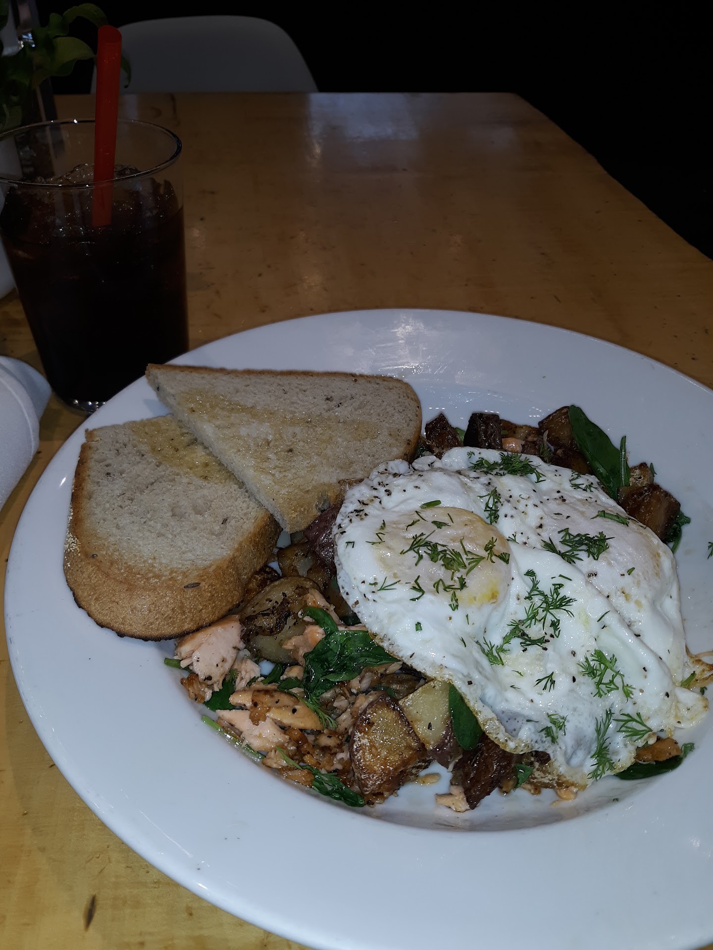 The first thing I noticed was the parking was horrid. Luckily someone was leaving as I was in process of turning around and giving up. I got a spot and went inside. The place was maybe at half capacity. Big issue with parking. There were two order stations, I wasn't quite sure which to go to. One had a line and looked like the focus might be bakery items, so I went to the other counter which had no line. I started looking at the menu board, but was interrupted by having a breakfast menu handed to me. I ordered from the breakfast menu, not sure if that meant the menu board was not available yet. I got the salmon hash. The salmon was very tasty, but the potatoes were too carmelized.