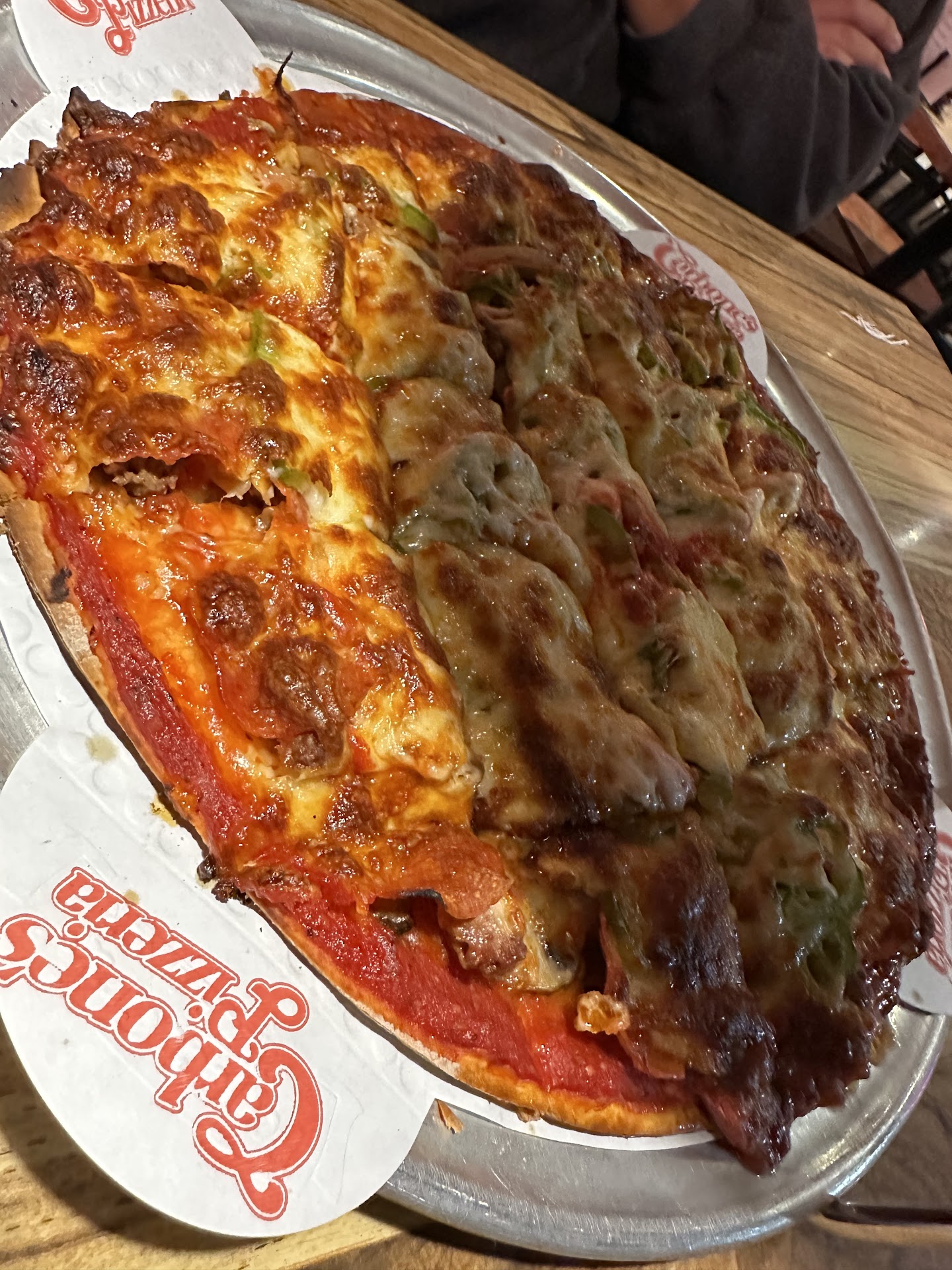 Read moreWhat I have learned in the 15 minutes at this Carbone's- Gatorade bottles make for the best water bottle bongs. I am not sure why the staff insisted on having this discussion as loudly as possible- but they did. While they quite couldn't figure out where my order was at, who cooked it, if it was cooked, they had plenty of time to discuss bongs. I thought it was a bit inappropriate and annoying. I understand the different points of view but this is a place of work -a family oriented pizza joint I would imagine is the goal. The pizza was okay, the SHAVED pickle skins were not spears it is exactly shaved pickle skins- sopping wet with grease and cold by the time they found my order - they could be good cooked right and served hot, Chicken wings I ordered were in no way baked then fried that skin was so soggy and gross. Cheese bread cold. It was okay. We go to the one on 70th over by Cottage grove middle instead now- ITS family friendly over there. I placed my order via phone, waited 15 minutes and came over to Carbones... to take it home.... they told me my stuff was cooking and then lost everything? Eventually found it. I am just sharing...