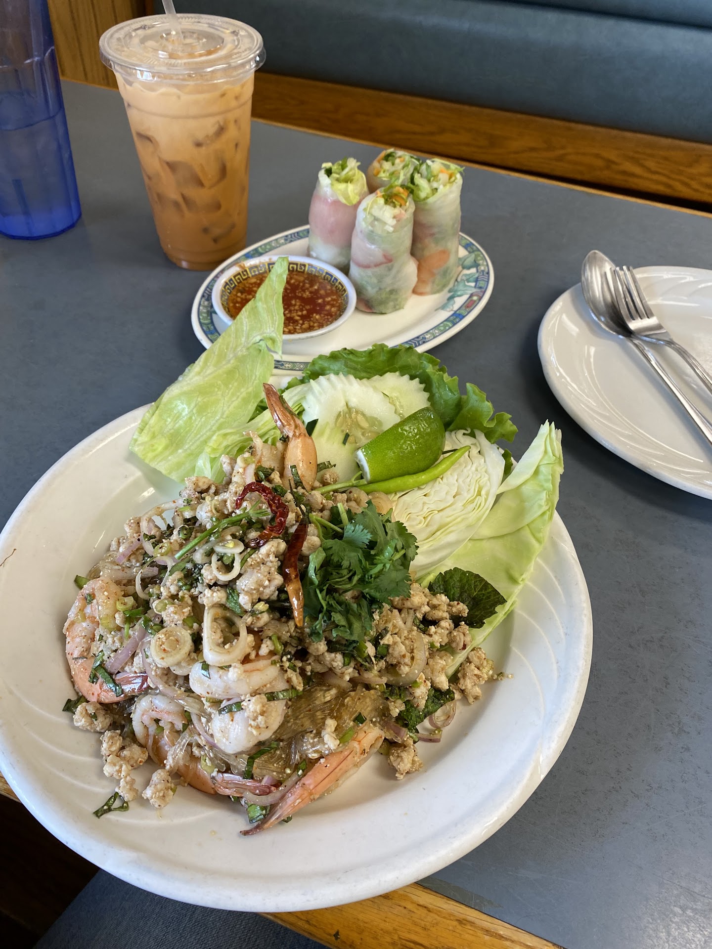 Read moreThe food is ALWAYS good here. The service is typically attentive and has a sort of communal-based workload. I have found that you may have to flag someone down for something if you need it. There was no knife with my utensils. I used the sharp edge of my spoon after the busser didn’t bring one out for me. Giant cabbage slices became handheld instead, not a real issue, but it would have been nice to practice dining etiquette. Usually the condiments at the table are grimy and need to be wiped down. My favorites are the Larb number 93 with glass noodle or without. The glass noodle was served with huge shrimp, very good. I’m questioning the cook who put wilted (read: old) mint leaves in a dish that’s known for the herbs that go into the dish, especially because it is summer. I picked those out (which was most of them). Recommendation for spice level: it’s hot here, and it’s not a joke, so don’t go crazy ordering hot if you’re not interested in your nose dripping from the spice. This is an authentic family restaurant with great culture and fabulous food in a former Burger King that is popular with the asian...
