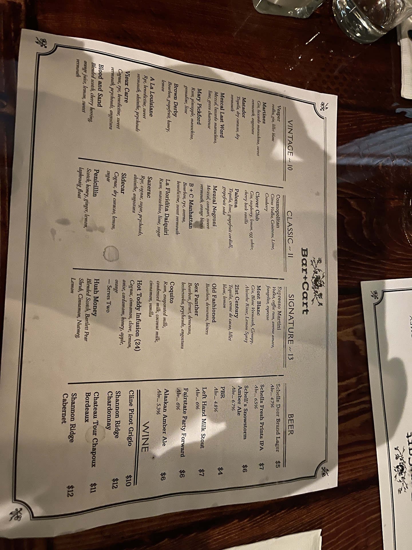 Read moreWe had date night and went to Bar and Cart. We were greeted immediately and taken to our table. The first thing you notice is that it’s very loud. It’s well decorated with cute little oil lamps at every table. We started out with some drinks. I got the seasonal Cunning Monkey which is banana infused aged rum, Velvet Falernum, Banana Liqueur, Pineapple Gomme, lime juice. Wow! This was delicious and refreshing. My wife got the Angel's in The Garden which is gin, lavender, Creme de Violette, Concord Grape Acid. Nice floral taste on the back side. I’m not a gin fan but this was amazing! We started off Burrata Pesto which is warmed burrata, herbed pesto, pistachio, golden raisins, local bare honey, parmesan, crostini. Amazing! Flavors all worked, the honey was so delicious with that salty crunch of the pistachio! Probably the best pesto I’ve had. This is a must try. For mains we got the shrimp Po Boy which is Grilled cajun shrimp, cajun remoulade, jalapenos, tomatoes, shredded lettuce. Po Boys are my favorite and unfortunately this fell flat to me. Shrimp and remoulade were delicious but it was served in a top split hotdog bun. A disservice to the Po Boy. We also got the Coney Island which is Coney island beef, yellow mustard, white onion, sport peppers. Initially we were not impressed but my wife mentioned they skipped the yellow mustard. We asked for some and wow that made a huge difference. Super flavorful and the Coney Island beef dog was delicious. We also wanted to try the chicken schnitzel which is garlic & sour cream smashed red potatoes. Lightly pan fried chicken breast, southern white gravy. This was worst of the 3. Lacked flavor and had a burnt taste. My wife scrapped some of the gravy away and you could see the chicken was burnt. Overall the place was nice. We definitely will be back for their appetizers and drinks. Side note they add 20% gratuity on your check which is split between...