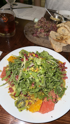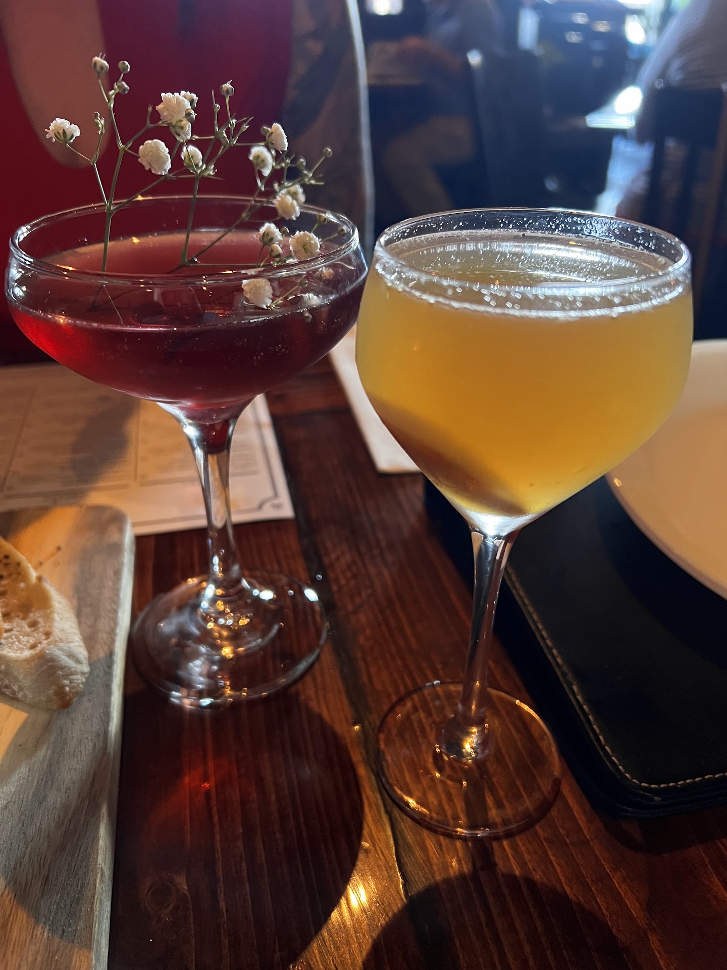 This place was overall a good experiance. We started with 2 drinks from the menu so we could add to our review. My partner did the Merry Pickford (1st drink photo below on the left) was an awesome cocktail and was not too sweet but very versatile for any pallet. I did the clover club to start and I think people who love sweet would highly highly enjoy I just found it to be too sweet with to thick of an egg white layer (I usually love cocktails with egg whites and understand the layer can vary) Again I believe sweet lovers would enjoy as an individual I wasn’t a fan but as a cocktail lover I know that others would. I feel their strong suit is their apps. We got the hummus which was delicious, my personal opinion is they tried to do too much with the tomatoes and olives and generous amount of balsamic but felt it took away from the hummus itself which I highly enjoyed. We also did the Burrata at first I was like “this is just ok” but it really grew on me and After a few bites it was probably my favorite thing of the night. The pesto and spices blended really well and baguette was perfectly toasted.