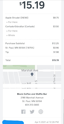 I came in and wasn't greeted. I'm noting it in hindsight with some other things here; but, I didn't really mind at the time because it was obvious that the server was busy and probably overwhelmed, judging by the way she was moving to fill orders. (There were maybe 4 or 5 tables already seated and just me at the counter.) After a few minutes of waiting, I ordered the Apple Strudel waffle (with baked apples, cinnamon, caramel, whipped topping) and a cafe cortado (espresso and milk). Tipped 15% upfront.