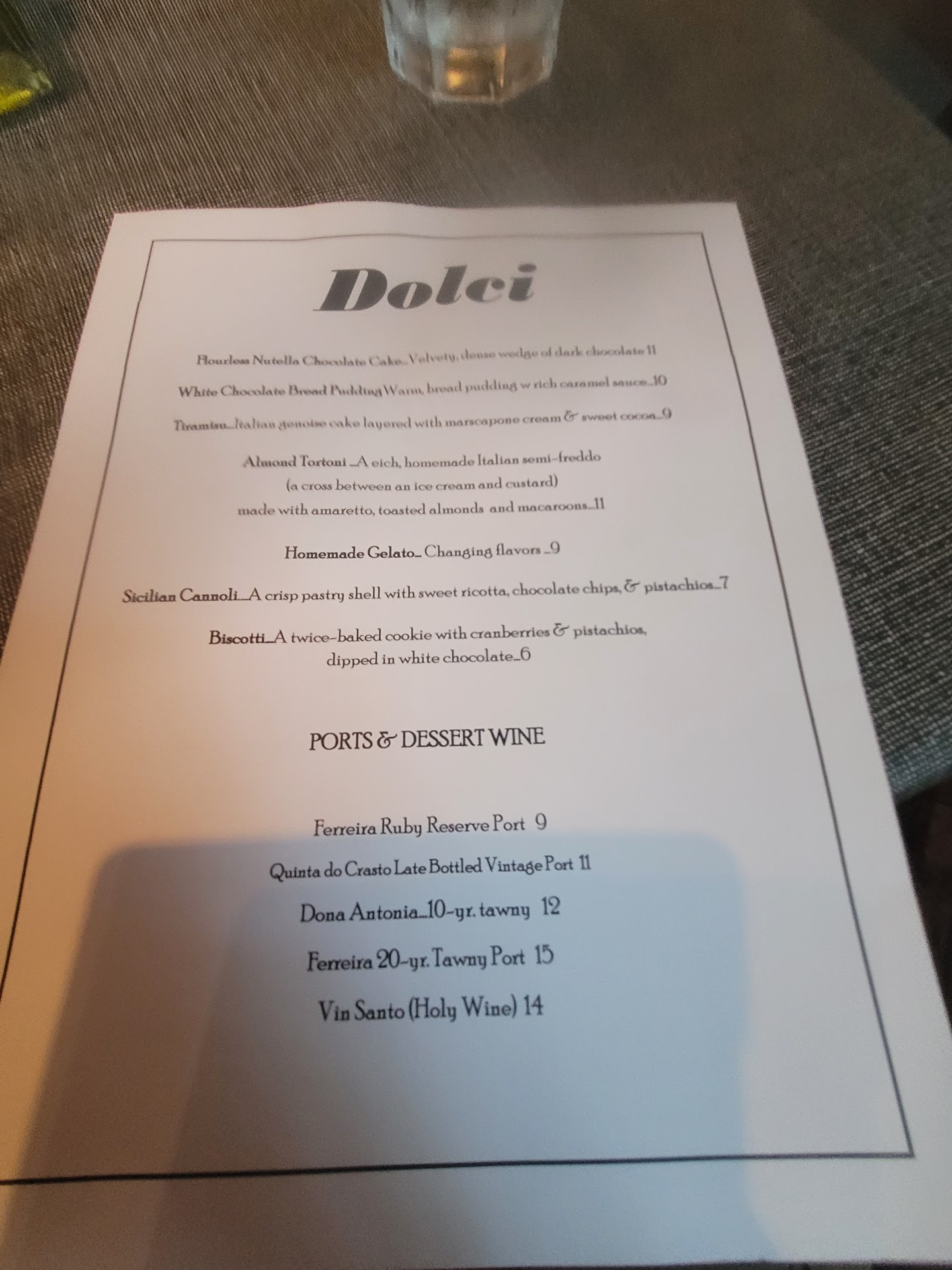 When the food came he offered Parmesan to everyone but me. I had ordered the veal scalopinne. When I asked for some he gave me a judgmental look and said "the Italians would not put Parmesan on the veal." I was shocked and asked that he do it anyway. He rolled his eyes at me as he grated the tiniest amount of Parmesan on my plate.
