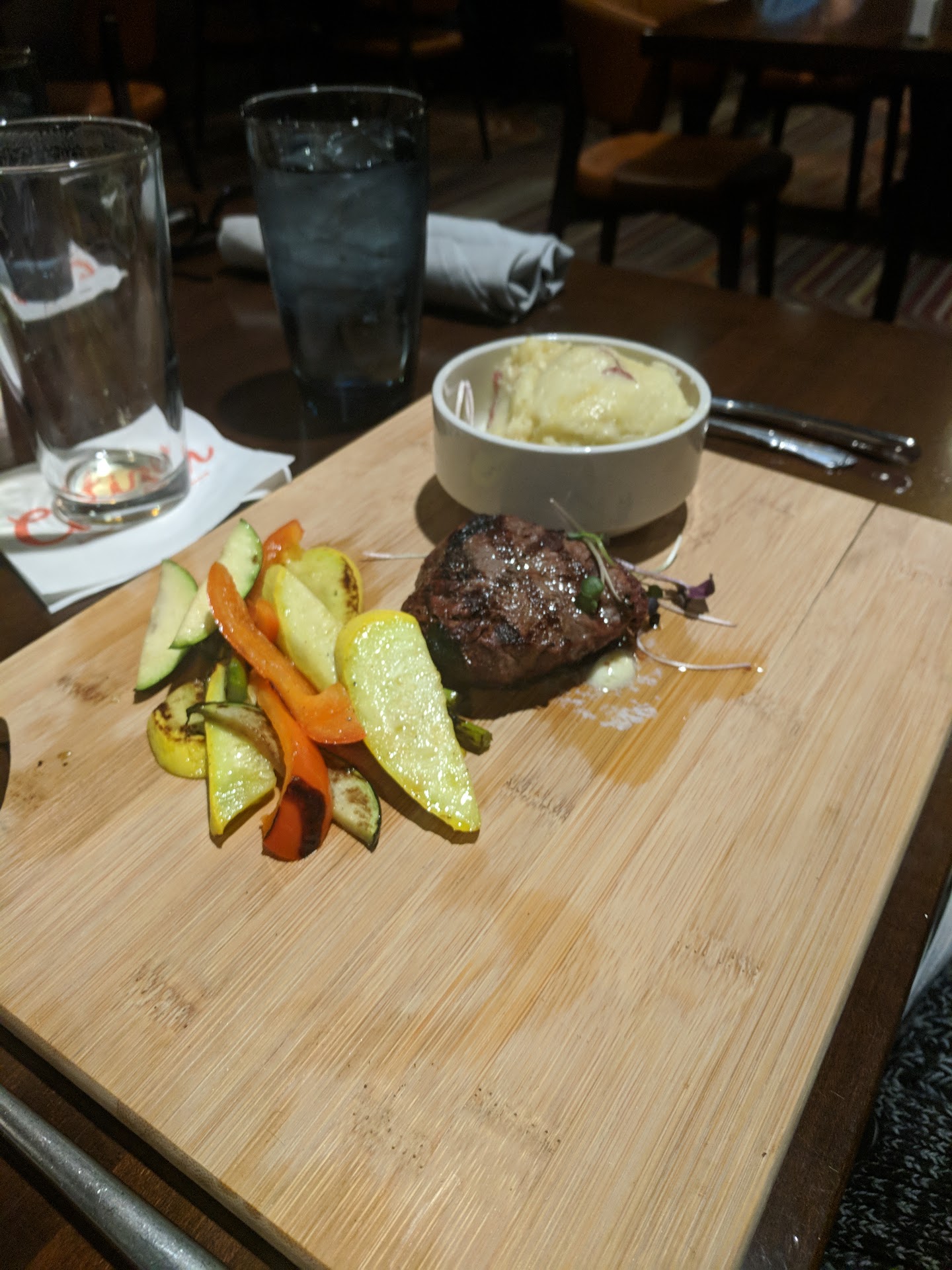 Food: I honestly forgot to take pictures of most of it and while it was presented in a fancy or 'foody' formatt the taste just didn't match. In fact I would say that in trying to have an out of the box presentation some of the food was difficult to eat. The fish for example was served in a bowl, so it was difficult to eat with a knife and fork. The steak was overcooked (and late to the table) even though it was ordered...