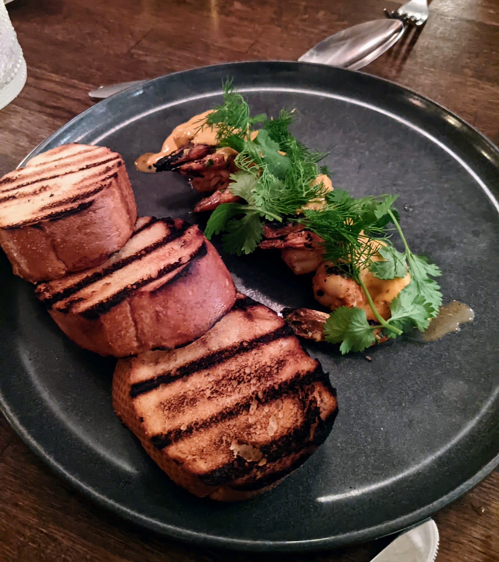 Shrimp Al ajillo - garlic butter sauce, pimenton, dill, cilantro, baguette -- The shrimp was cooked perfectly and the sauce was delicious.