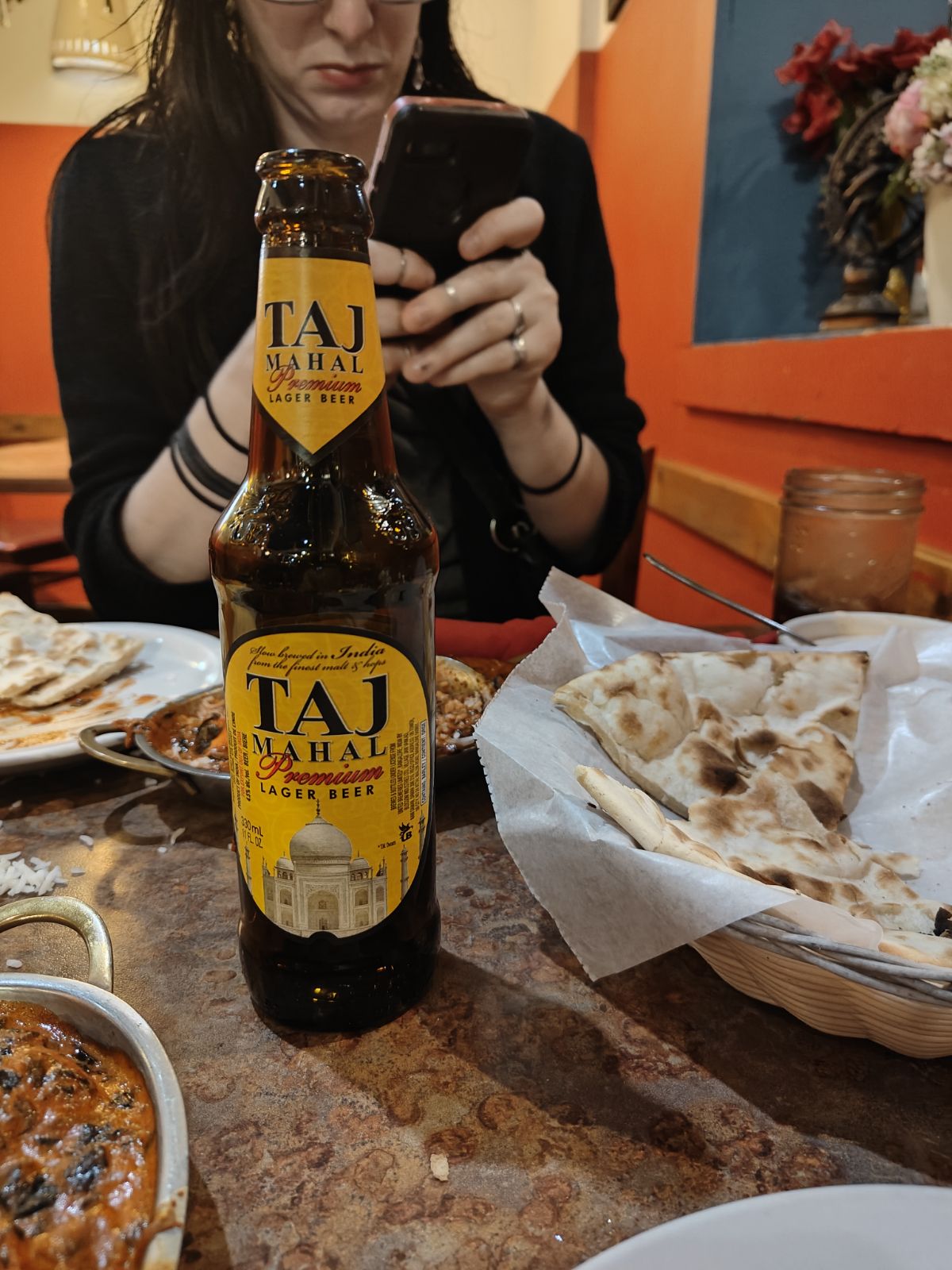 We arrived near to close, maybe 1 hour and 15 minutes before they closed up shop, but we still received quite excellent service. I strongly got the feeling that this is family owned and run business, which easily kicked it up a notch in my experience - and it was only confirmed when our food arrived. I started with a "Taj Mahal Premium" lager, imported from India - I quite enjoyed it, and wish I had ordered the larger size bottle (I don't normally drink much of anything, particuarly beer, but this was shockingly good), whereas my wife Elizabeth ordered a mango lassi (think like, a yogurt milkshake) since we both ordered the same dish, in the end - Palak Paneer; however I ordered mine to be of medium spiciness, Liz asked for "as spicy as you can make it." ...,my wife REALLY likes spicy food.