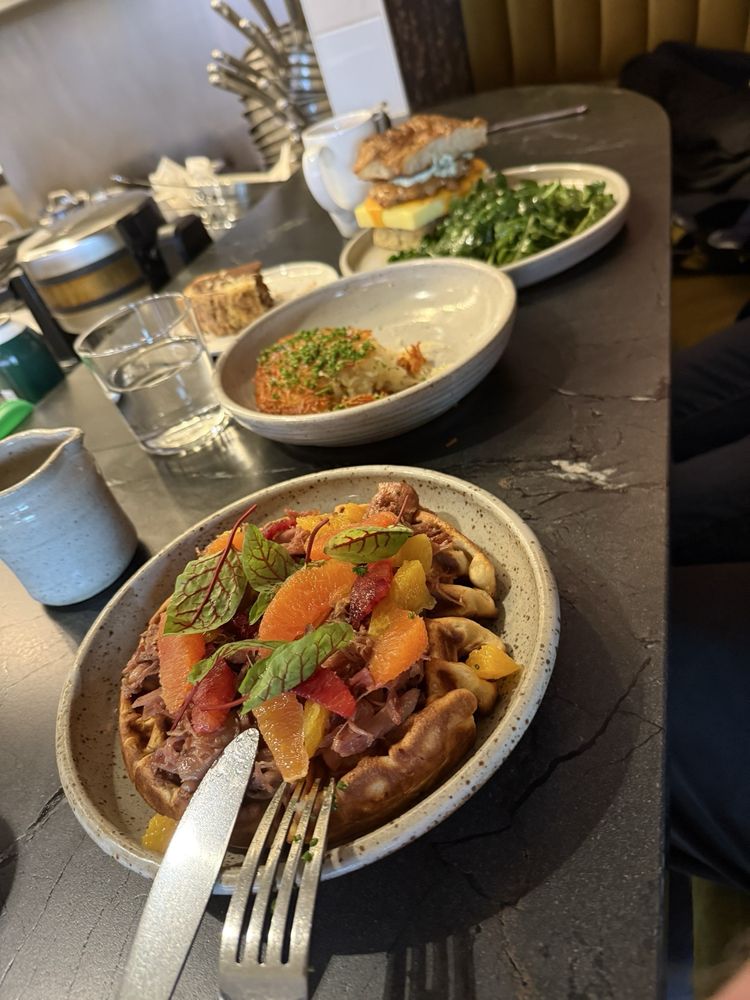 We sat at the kitchen table and was immediately engaged by the two chefs, Ben and Grant. I ordered the waffle with duck confit and citrus, Doll got the breakfast sandwich and asked to swap out the pork belly for the chicken maple sausage, no problem. And we got a slab of their hashbrowns! The food was all fantastic, great mix of flavors with the waffle with duck and a mild spicy maple syrup. The focaccia that was used for the egg sandwich was soft and not crusty. The egg souffle was topped with a savory herb aioli, which Doll loved. Interesting take on the hashbrowns, they form a rectangle slab of potatoes and fries them first and then finish them off in the oven, mighty tasty. Really good vibe to the place and engaging chefs. The experience is always better with a friendly staff. We did talk with our waiter, just no so much. Nice man, didn't catch his name, he was attentive and always there when he was needed.