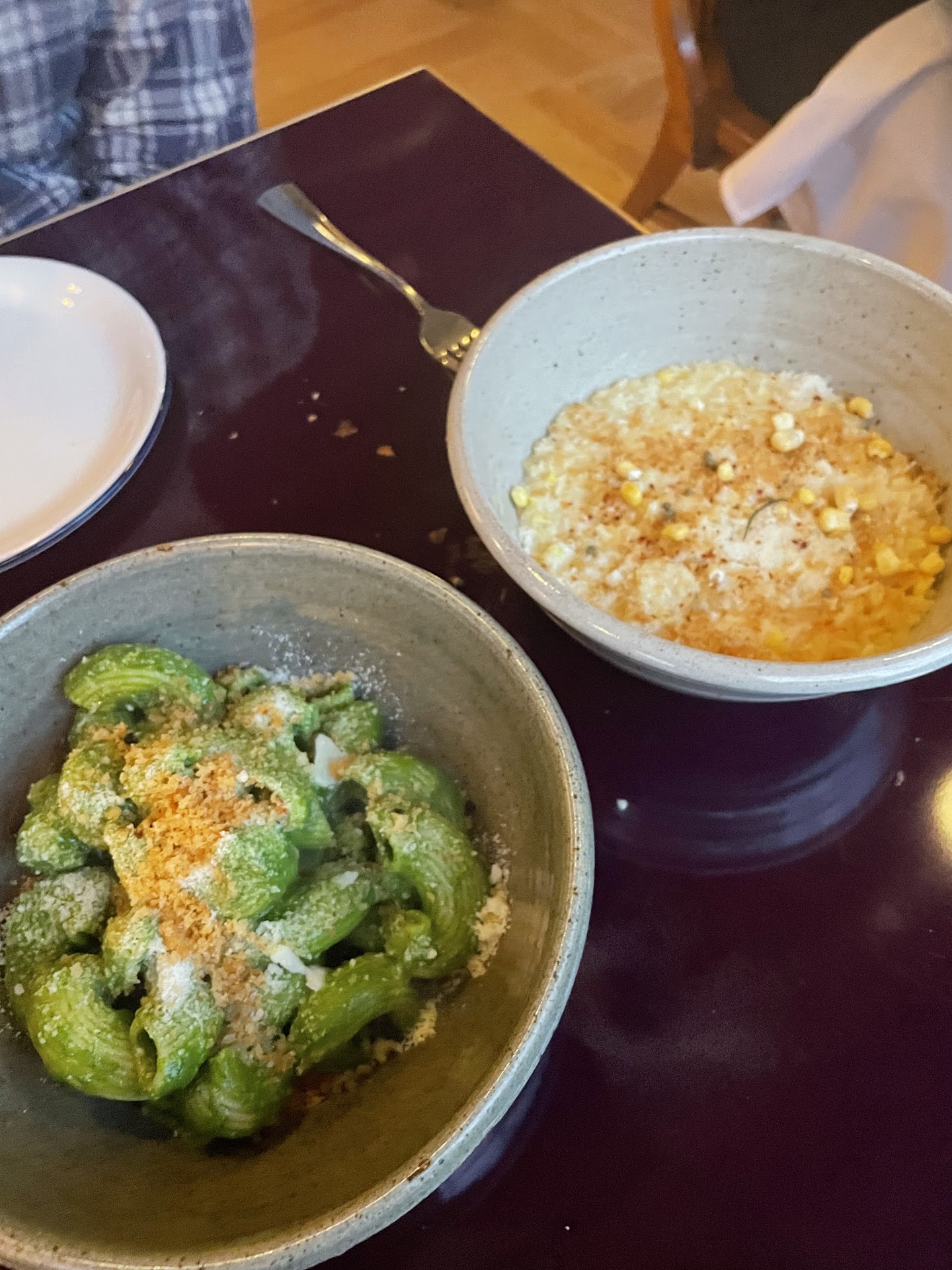 The grilled seppia with the eggplant puree was delicious, as was the roasted corn pastina with taleggio. Great corn flavor. Very summery and lovely. All the pasta is fresh and house-made. The spaghetti amatriciana with tomato, lamb bacon, and pecorino was tasty but too spicy for my taste. My husband thought it was great however. My main course was lamb with beets, feta more like a feta cream, and chili crisp. The lamb was great. I could not eat the rest because it was so so very spicy. I just couldn't eat it. My husband said it was okay. If you don't like really spicy, skip that dish.