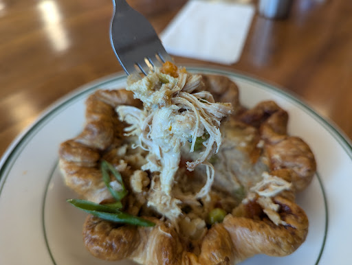 The pie was visually lovely. Cooked really nicely the crust was evenly browned. I am used to buttery crust and this was not that. It was crust flavored and was not strong in character but was perfectly edible and had a nice fell to it and was not under or over cooked. When you under cook it then it is a doughy mess. This did not have that problem. After breaking through the top crust I noted that this version of Chicken Pot Pie was more dry than expected. I am used to the gravy of frozen pies so this was very different from that. The chicken portion was generous with a combination of white and dark meats and the flavor was subtle not strong. I like strong flavors. All in all, the experience was fine but not exciting. The portion was large enough to feed 2, especially if you want to try other things in the restaurant. We found that ordering an extra portion of the gravy they sold with the biscuits enhanced the pie significantly. Matter of fact, I'd recommend this if my Pot Pie experience was standard for them. The biscuit gravy is quite good.