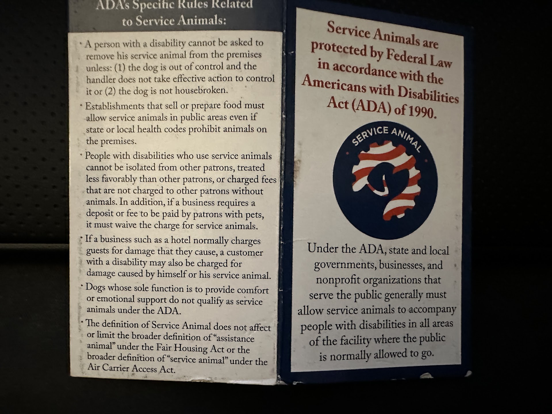 But the two-star review really comes down to the fact that there was a medium-sized, black dog seated under the booth behind us for the entire time we were in there. It was clearly not a service dog (the owners took it outside at one point to greet friends they saw thru the window, and it was pulling like crazy, obviously neither trained as a service dog nor identified as one). In addition to being a clear health code violation, it shows a lack of consideration for other patrons on the part of both the owners and...
