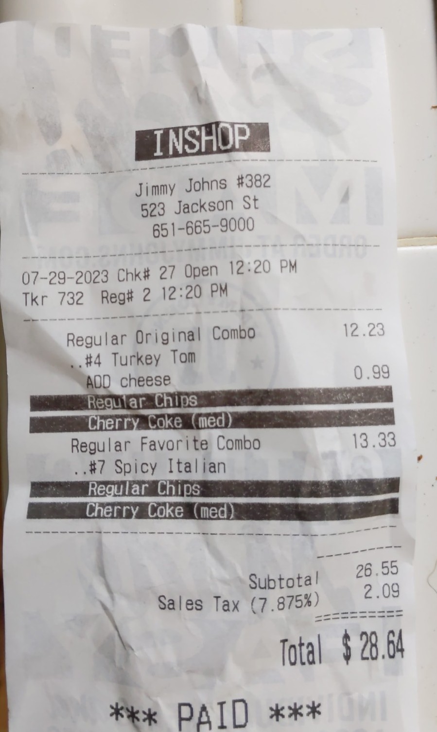 Ā Ā Ā Read moreI love Jimmy John's sandwiches and the service I got in the past, as well as the service I experience at the other downtown store in the skyway of the St. Paul Doubletree Hotel center (formerly located at 7th Place between Bruegger's Bagels and Walgreen's drug). I usually order online from this location and get my order within 10-15 minutes, and the drivers have always been courteous.