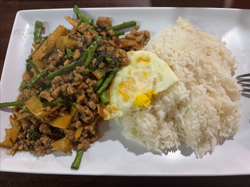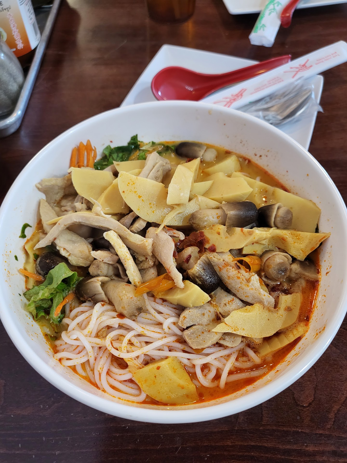 Kawapow Chicken and Rice comes with a fried egg- kawapow chicken overall sweet and delicious, bamboo is soft, lightly crunchy vegetables and it all just melts in your mouth. I don’t take spicy food very well and the cook accommodated this very well! Very flavorful basic dish without any overwhelming spices!
